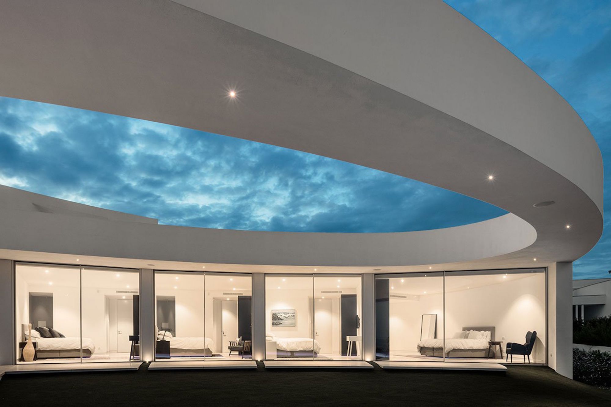 La base ellittica si estende per 450 metri quadrati abbracciando l’ovale galleggiante che delimita delicatamente il patio centrale della casa e la piscina posti sul pendio erboso del giardino.