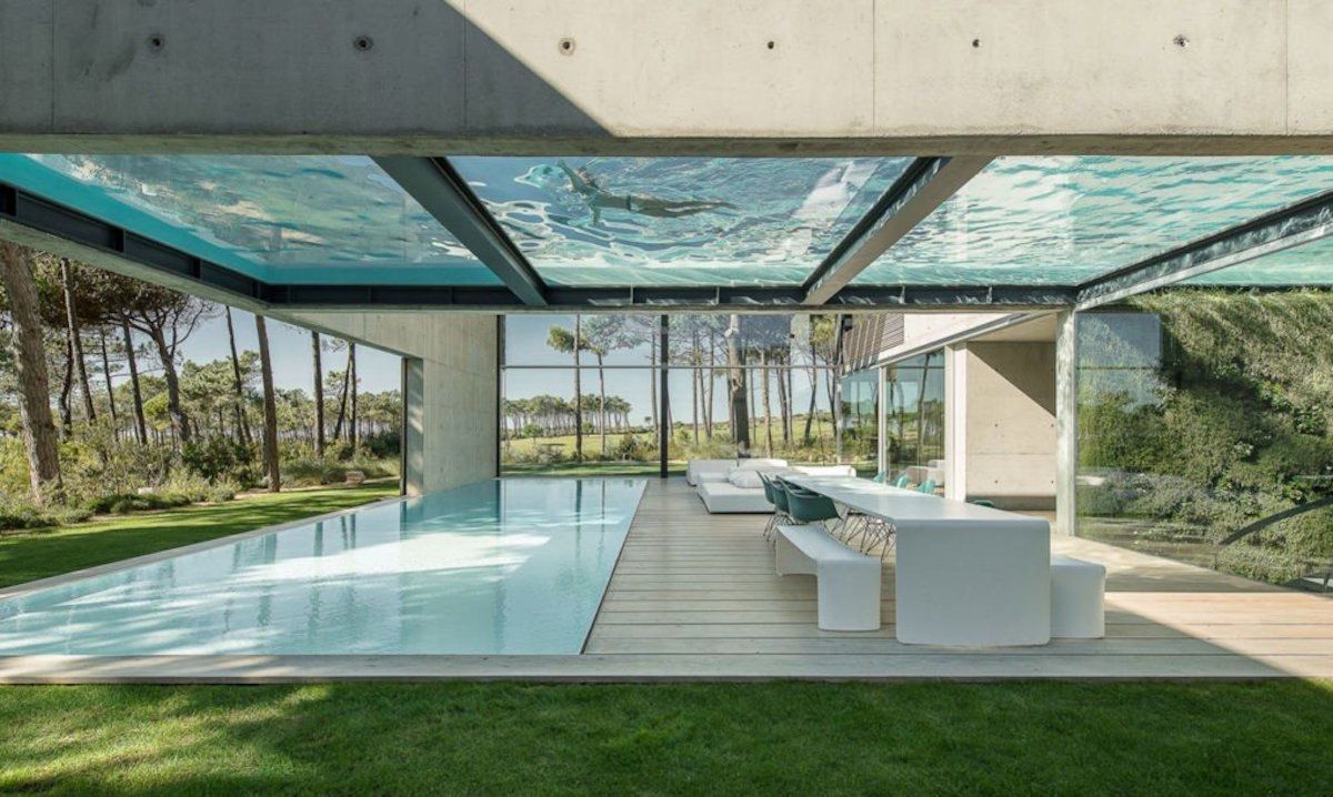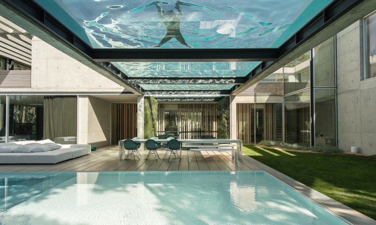 La struttura a ponte con due piscine bisezionali: una a livello del suolo e l’altra che, sospesa al primo piano, le si libra sopra. Un fondo in vetro, non solo crea un effetto visivo surreale che regala l’illusione di galleggiare nell’aria, ma offre ai nuotatori la possibilità di guardarsi a vicenda e magari muoversi all’unisono.