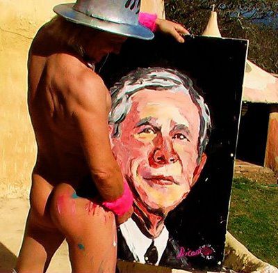 Pricasso, deve la sua formazione artistica all’Accademia d’Arte in Inghilterra, si definisce il più grande “Penile Artist” al mondo. Lo scorso anno aveva partecipato all’Archibald Prize il più importante concorso australiano di ritrattistica, con una tela che raffigurava un chirurgo estetico. I giudici non erano rimasti impressionati dalla sua perfomance. A distanza di un anno ha quindi pensato di ripresentarsi al concorso, questa volta con un autoritratto: Tim Patch si è immortalato nudo, con un capello in testa ed una tela a coprire il suo “strumento” di lavoro, ma ancora una volta ,sebbene apprezzato per la sua arte innovativa e fantasiosa, non è riuscito a classificarsi tra i finalisti. Tim Patch ha iniziato questa bizzarra attività diversi anni fa, in occasione di una festa natalizia. In breve quella che era stata dettata dalla goliardia del momento si è trasformata in una vera è propria professione, per giunta ben retribuita, 250 dollari per una firma in calce, mica male per uno che dipinge con il pene. Nei suoi stravaganti ritratti Pricasso utilizza solamente colori ad acqua e tele ben levigate per evitare abrasioni in una parte tanto delicata. La sua più famosa collezione è “Word Leaders”,in cui ritrae molti celebri capi di stato, reali e leader politici che governano attualmente il mondo. Famosissime sono le sue creazioni al “Health Sexuality and Lifestyle Exhibition”, la quarta giornata del Sexpo, la celebre fiera australiana interamente dedicata al sesso. Chiunque volesse un proprio ritratto fatto da Pricasso può scrivergli sul suo sito ufficiale inviadogli una propria foto al suo sito. In poco tempo anche voi potrete vantare una autentico Pricasso … i prezzi ?!? direi molto alti. Del resto si sa, il colpo di “pennello” non conosce crisi.