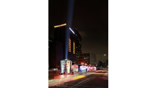 La prima installazione è avvenuta a Seoul, dove, in una grande piazza, sono stati collocati 17 serbatoi, collegati tra loro da normalissimi tubi dell’acqua, ed illuminati all’interno da luci al neon tutte differenti tra loro e in continuo cambiamento, permettendo così dei particolari giochi di luce.