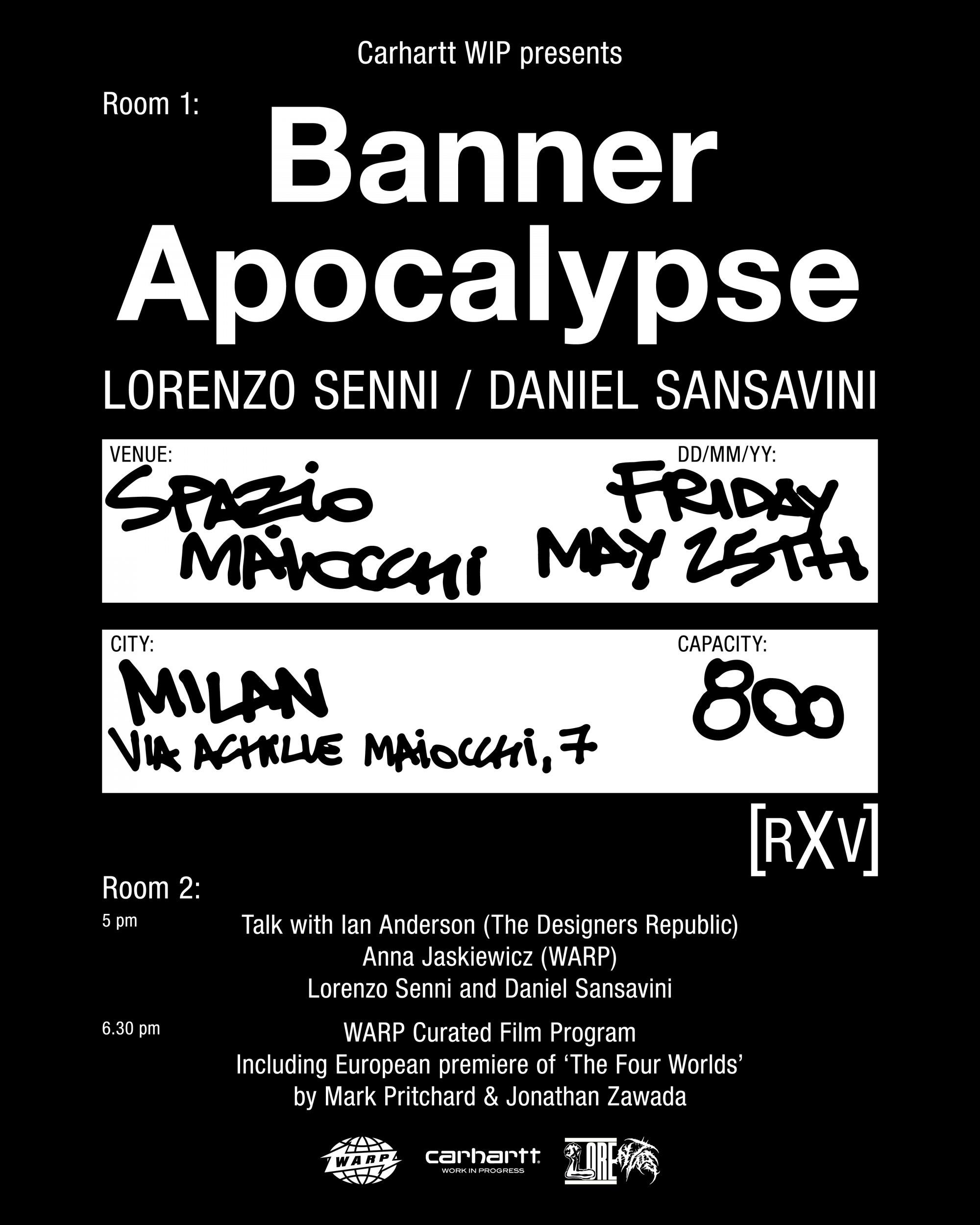 L'ormai rinomato spazio artistico milanese, Spazio Maiocchi, fondato da Carhartt WIP & Slam Jam, ha deciso di omaggiare questo cantante attraverso BANNERAPOCALYPSE, un'incredibile retrospettiva che include oltre 50 banner disegnati da Sansavini e utilizzati da Senni. Sarà possibile partecipare a questa esposizione il prossimo venerdì 25 maggio in Via Achille Maiocchi 7, per un'incredibile serata che spazierà tra talk (previsto per le ore 17.00) in compagnia del fondatore di The Designers Republic, Ian Anderson, la proiezione in esclusiva del video musicale Phantom Brickworks di Bibio, e Safe di Darkstar, diretto da Cieron Magat, insieme a The Four Worlds di Mark Pritchard e Jonathan Sawada.