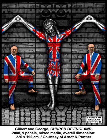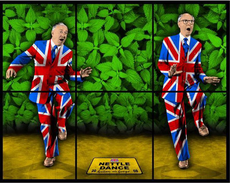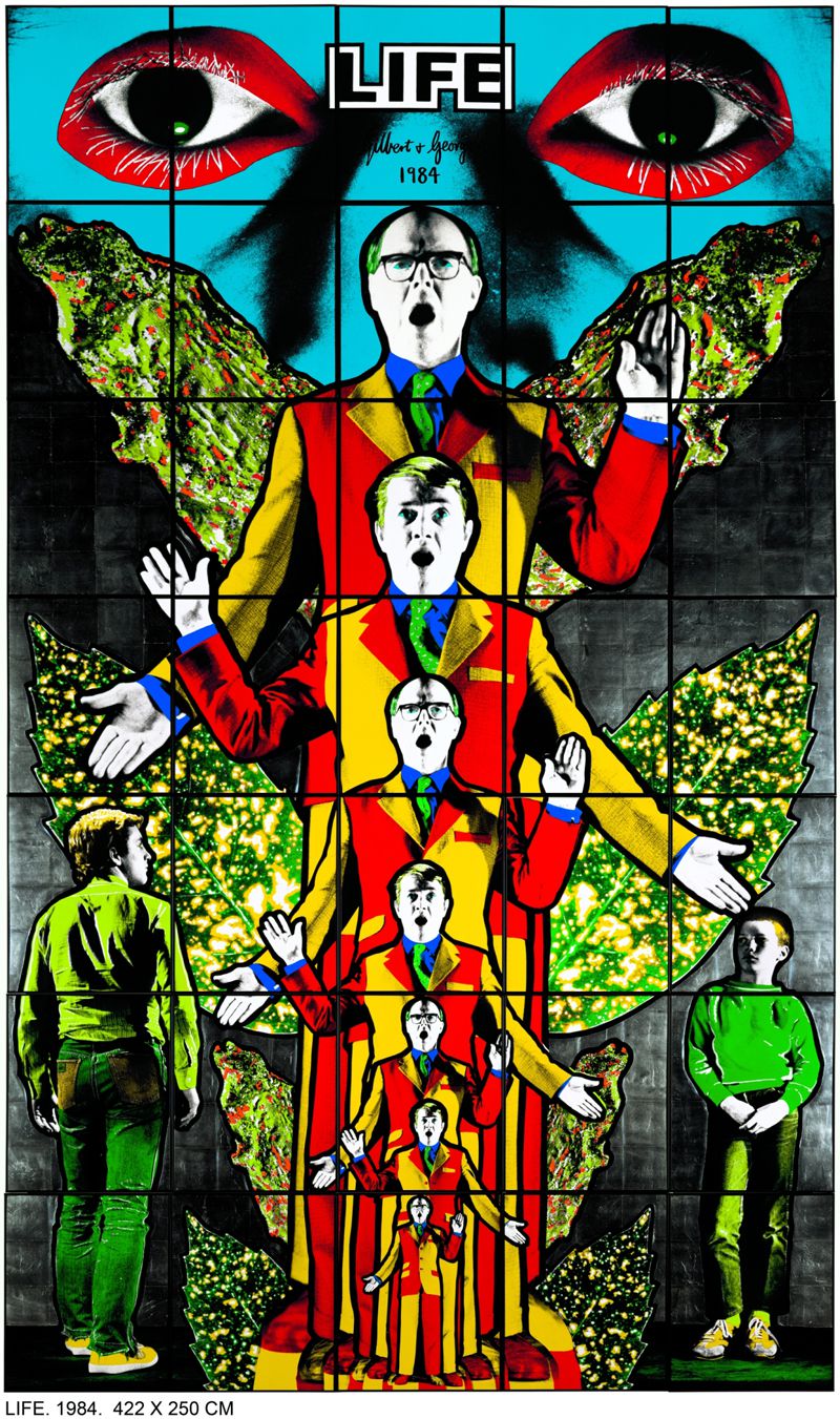 Gilbert & George (Gilbert Italiano,George Inglese) , due artisti che formano la coppia più eccentrica del Regno unito. Si conosco alla St. Martin school of Art di Londra. Unendo le loro due menti geniali si presentarono come performer nei panni di “singing sculputures”: dipinti di una vernice metallica e vestiti dei loro completi grigi da uomini d’affari vecchio stampo, i due salgono su un piedistallo e a intervalli regolari cantano una popolare canzone inglese “Underneath the Arches”. Da allora vivono e lavorano insieme nel quartiere industriale di Spitafields (East End di Londra).