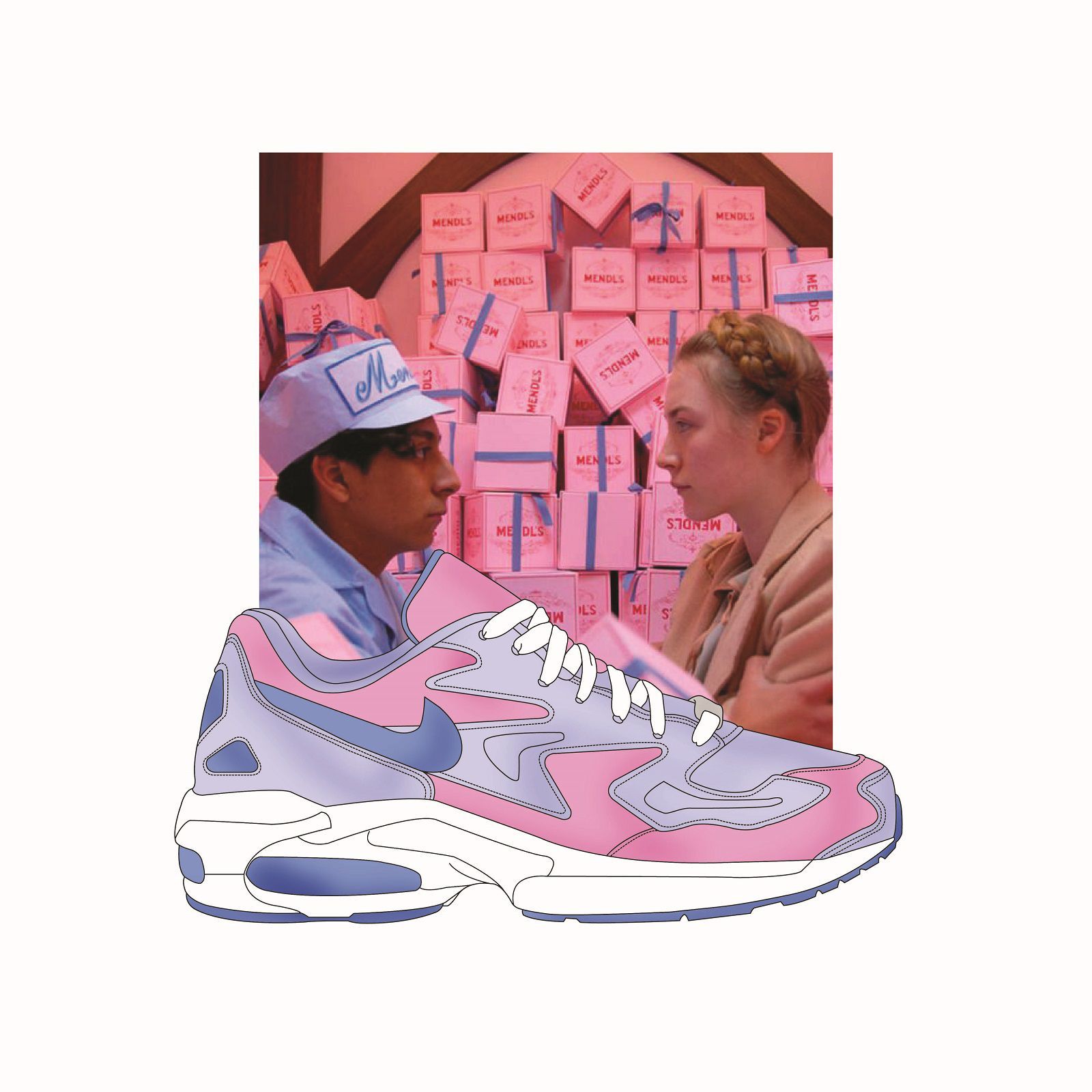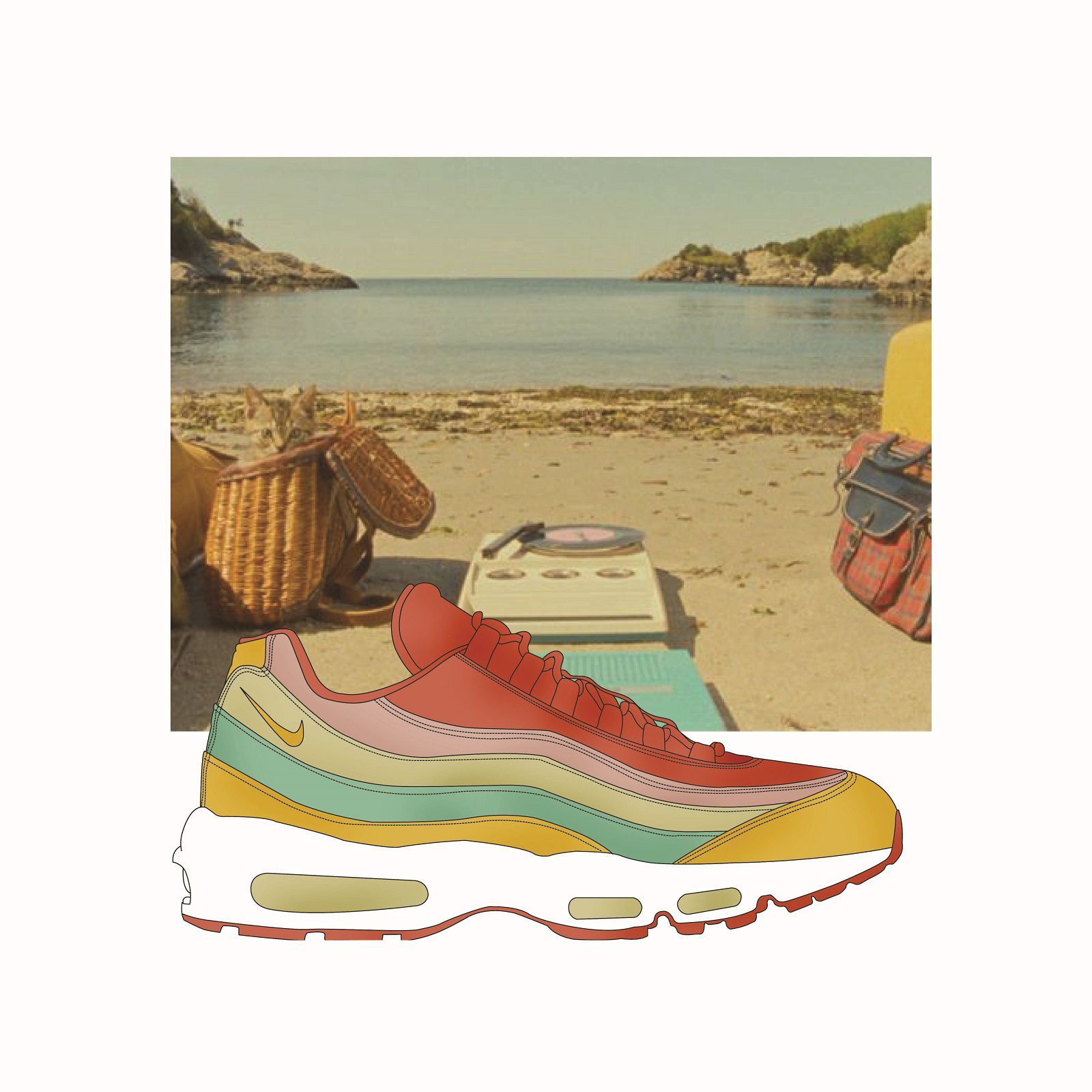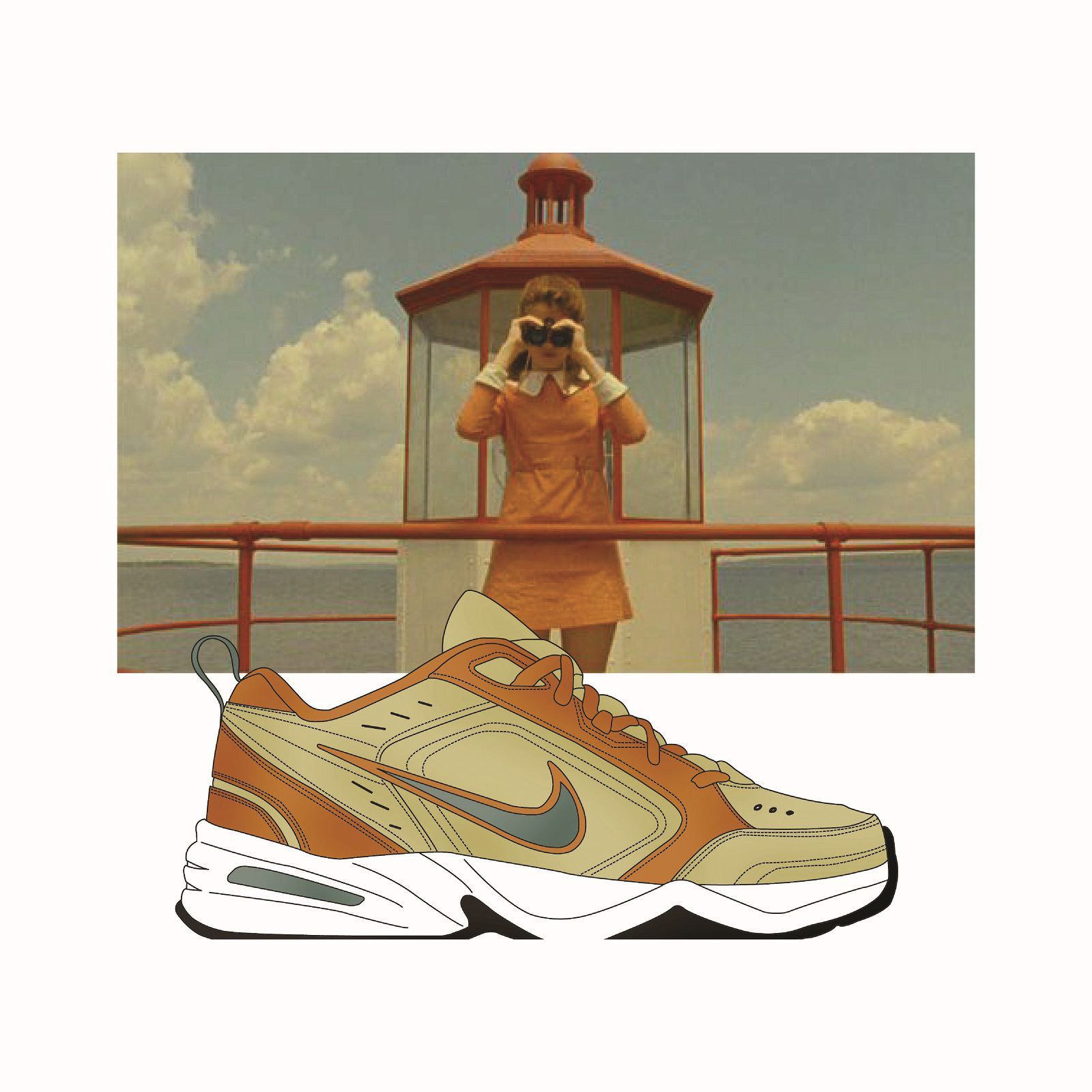 Sullo sfondo di grandi cult del cinema indie firmati Wes Anderson, da Grand Budapest Hotel a Moonrise Kingdom, fino a Fantastic Mr Fox, spiccano le silhouette più hype del momento, come la Nike Air Monarch, la Nike Air Max 95, la Nike Air Max Tn o un classico intramontabile come la Jordan. Sono principalmente i colori a riflettere l'incontro fra questi due mondi: il berretto rosso indossato da Bill Murray in Le Avventure Acquatiche di Steve Zissou si riflette nello Swoosh della scarpa nella stessa tonalità, i toni rosa e azzurro delle scatole della famosa pasticceria Mendl's in cui lavora Saiorse Ronan in Grand Budapest Hotel sono rielaborati nella Air Max Light 2, mentre i colori del bagno di casa Tenenbaum corrispondono a quelli di una Nike M2K Tekno.