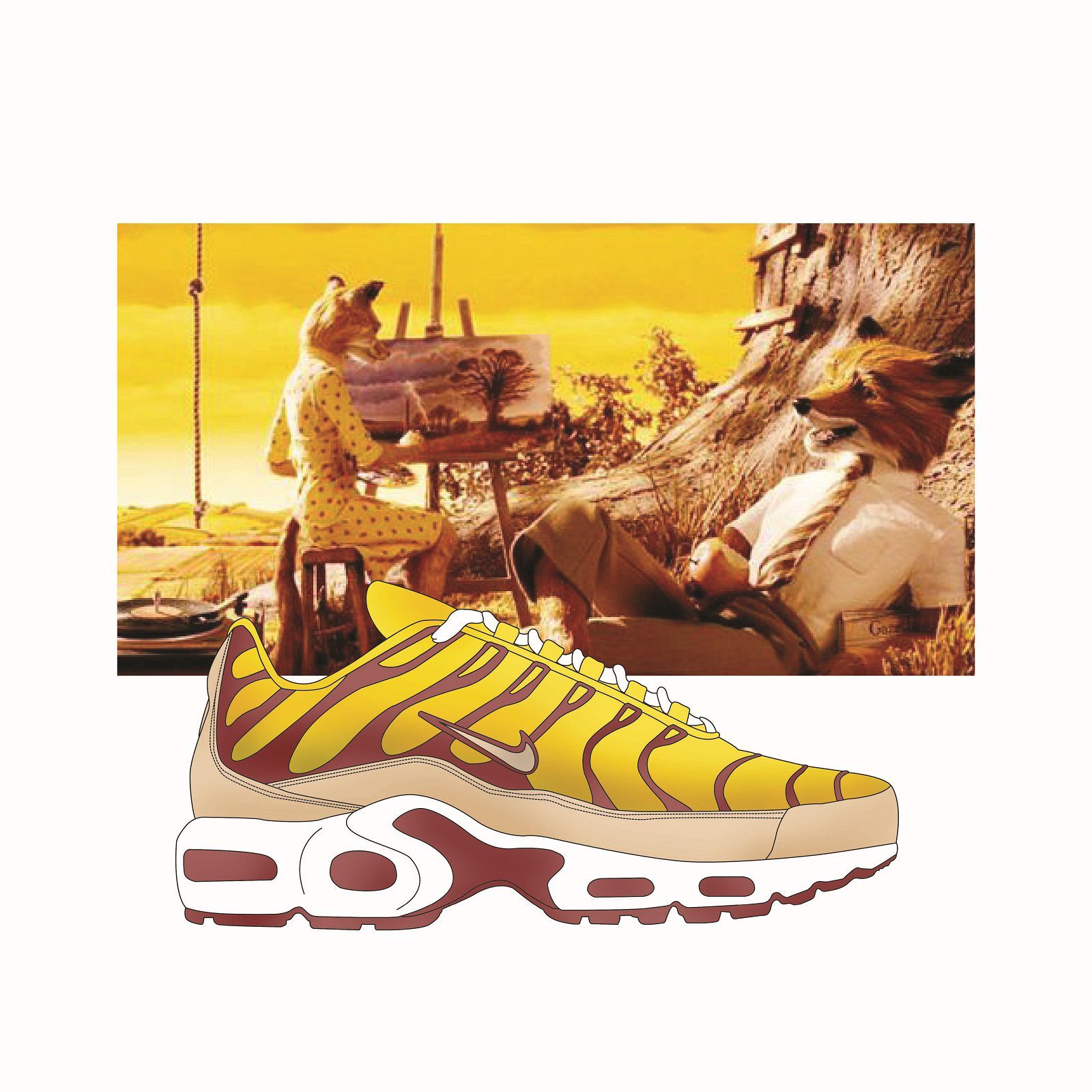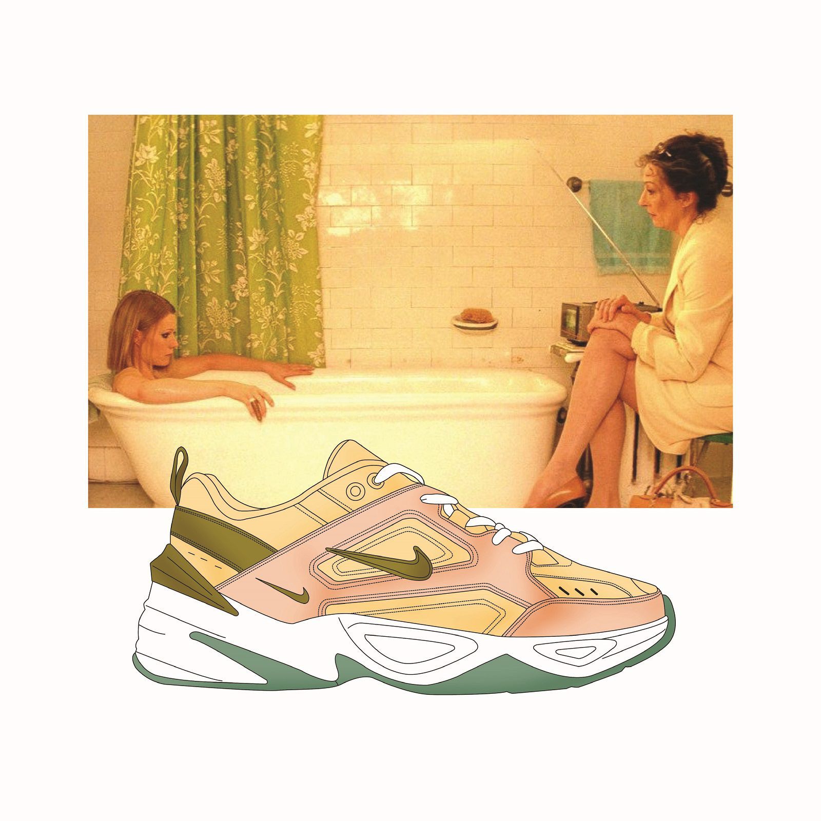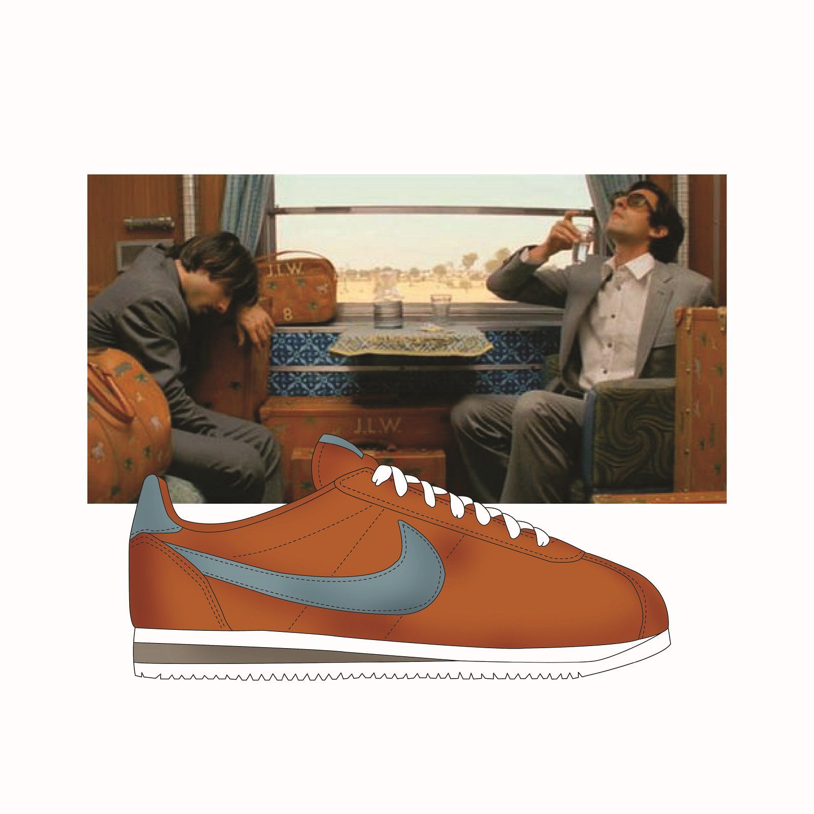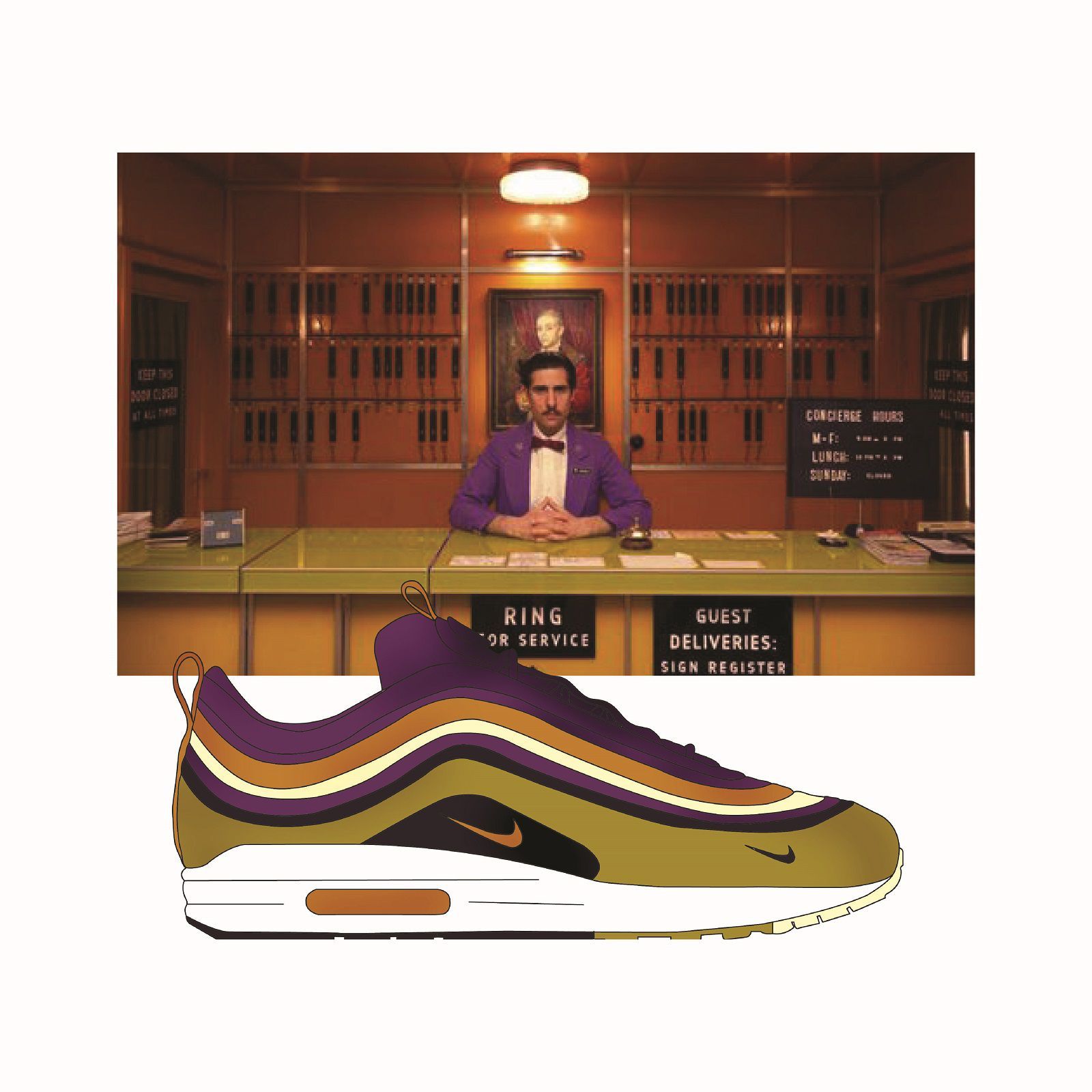 Sullo sfondo di grandi cult del cinema indie firmati Wes Anderson, da Grand Budapest Hotel a Moonrise Kingdom, fino a Fantastic Mr Fox, spiccano le silhouette più hype del momento, come la Nike Air Monarch, la Nike Air Max 95, la Nike Air Max Tn o un classico intramontabile come la Jordan. Sono principalmente i colori a riflettere l'incontro fra questi due mondi: il berretto rosso indossato da Bill Murray in Le Avventure Acquatiche di Steve Zissou si riflette nello Swoosh della scarpa nella stessa tonalità, i toni rosa e azzurro delle scatole della famosa pasticceria Mendl's in cui lavora Saiorse Ronan in Grand Budapest Hotel sono rielaborati nella Air Max Light 2, mentre i colori del bagno di casa Tenenbaum corrispondono a quelli di una Nike M2K Tekno.