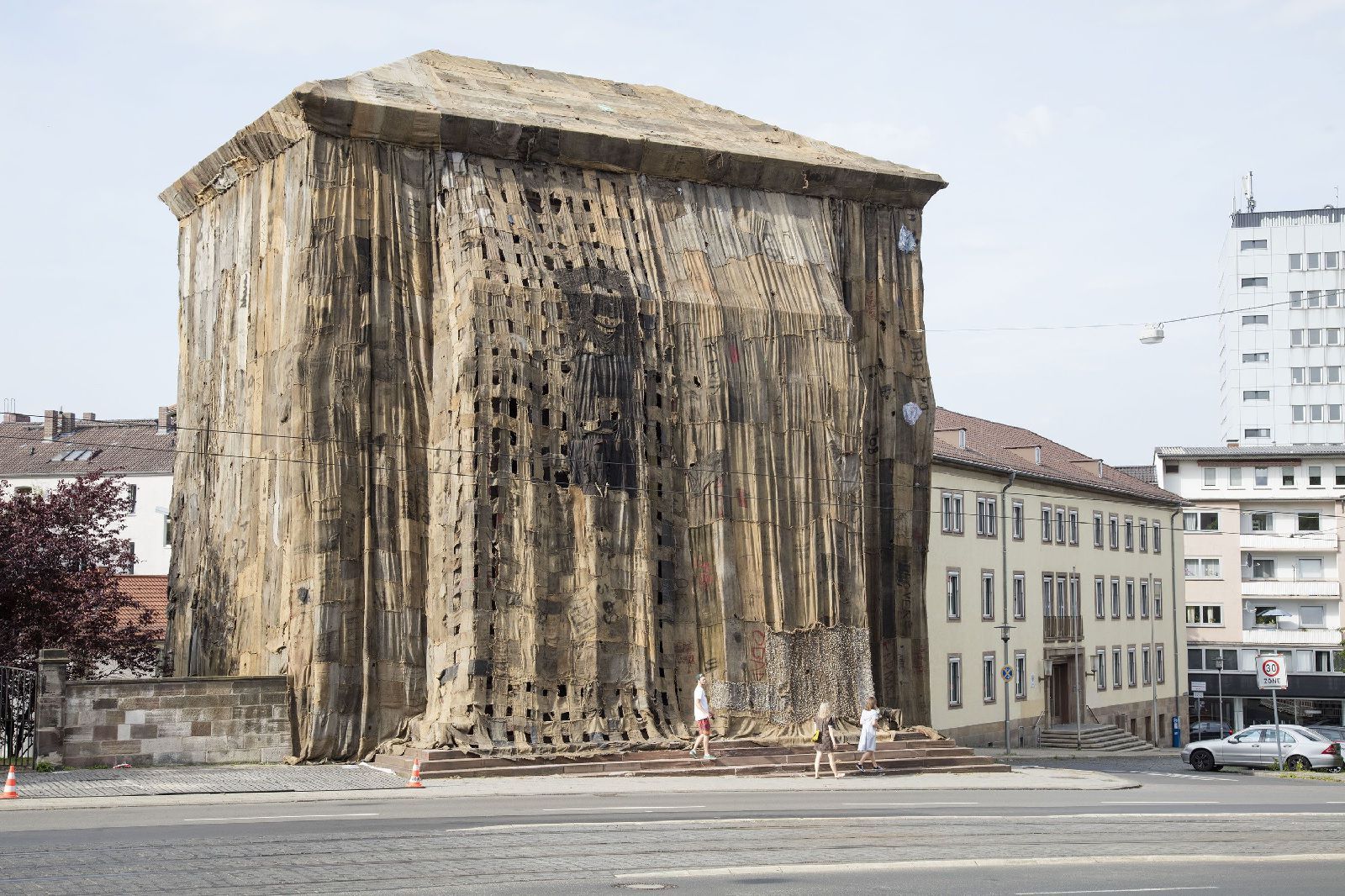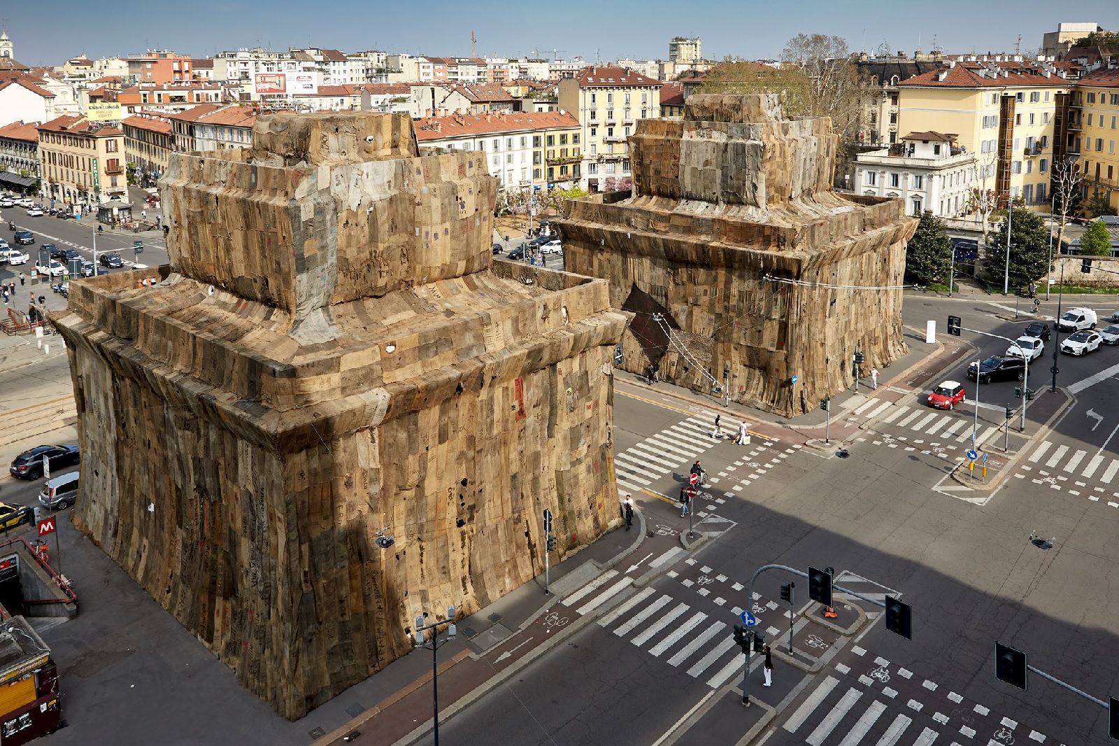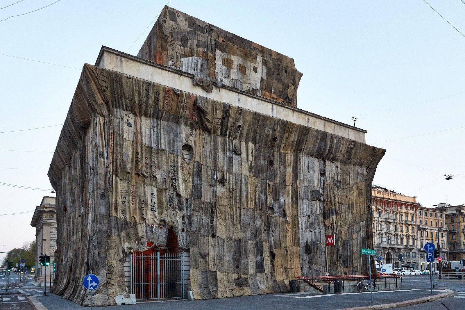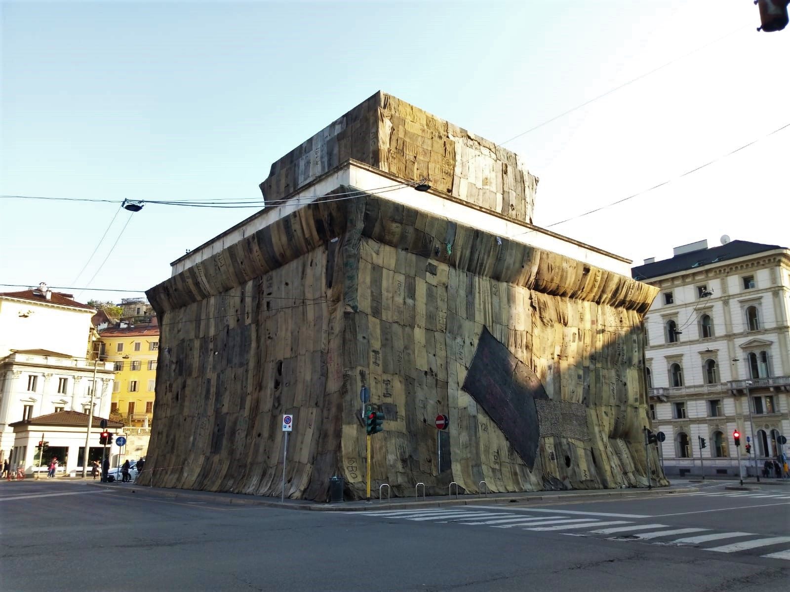 Il ghanese Ibrahim Mahama è l’autore della mega installazione a Porta Venezia A Friend. Ingaggiato dalla Fondazione Trussardi, l’artista ha avvolto gli imponenti Caselli Daziari con sacchi di juta, un modo per far riflettere su temi importanti come la migrazione, la globalizzazione, la circolazione delle merci e delle persone attraverso i confini e le nazioni. I sacchi di juta vengono fabbricati in Asia, importati in Africa per il trasporto su scala internazionale di merci di vario genere e poi strappati, rattoppati. Queste loro ricuciture sono il simbolo di conflitti e drammi che da secoli si consumano all’ombra dell’economia globale. Mahama spiega che ognuno di essi
