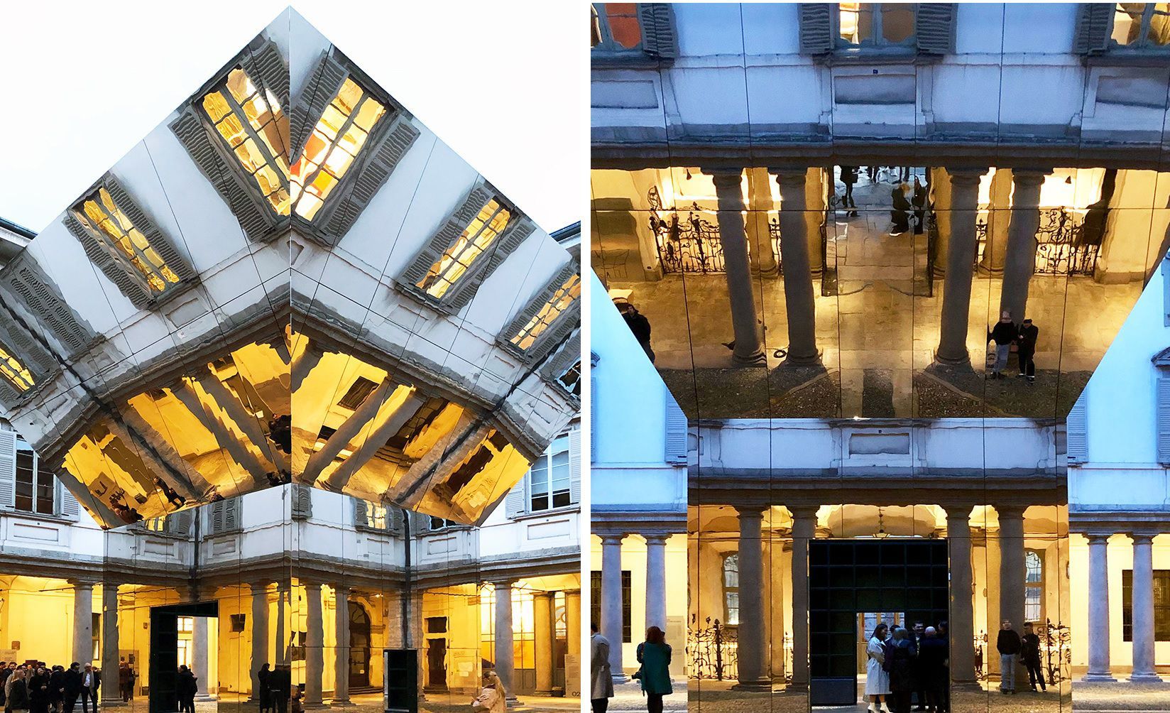 La Corte d’Onore di Palazzo Litta ospita Echo: il padiglione scultura realizzato Pezo von Ellrichshausen. L’opera, concepita come permanente, è un monolite composto da due volumi sovrapposti, un cubo accessibile e una piramide rovesciata aperta verso l’alto. Rivestita di specchi, la struttura riflette all'esterno il colonnato barocco, mentre, all’interno, svela una porzione di cielo, isolando l’elemento naturale dal contesto della città. Lo studio di architettura cileno fondato nel 2002 da Mauricio Pezo e Sofia von Ellrichshausen ha spiegato in un’intervista: