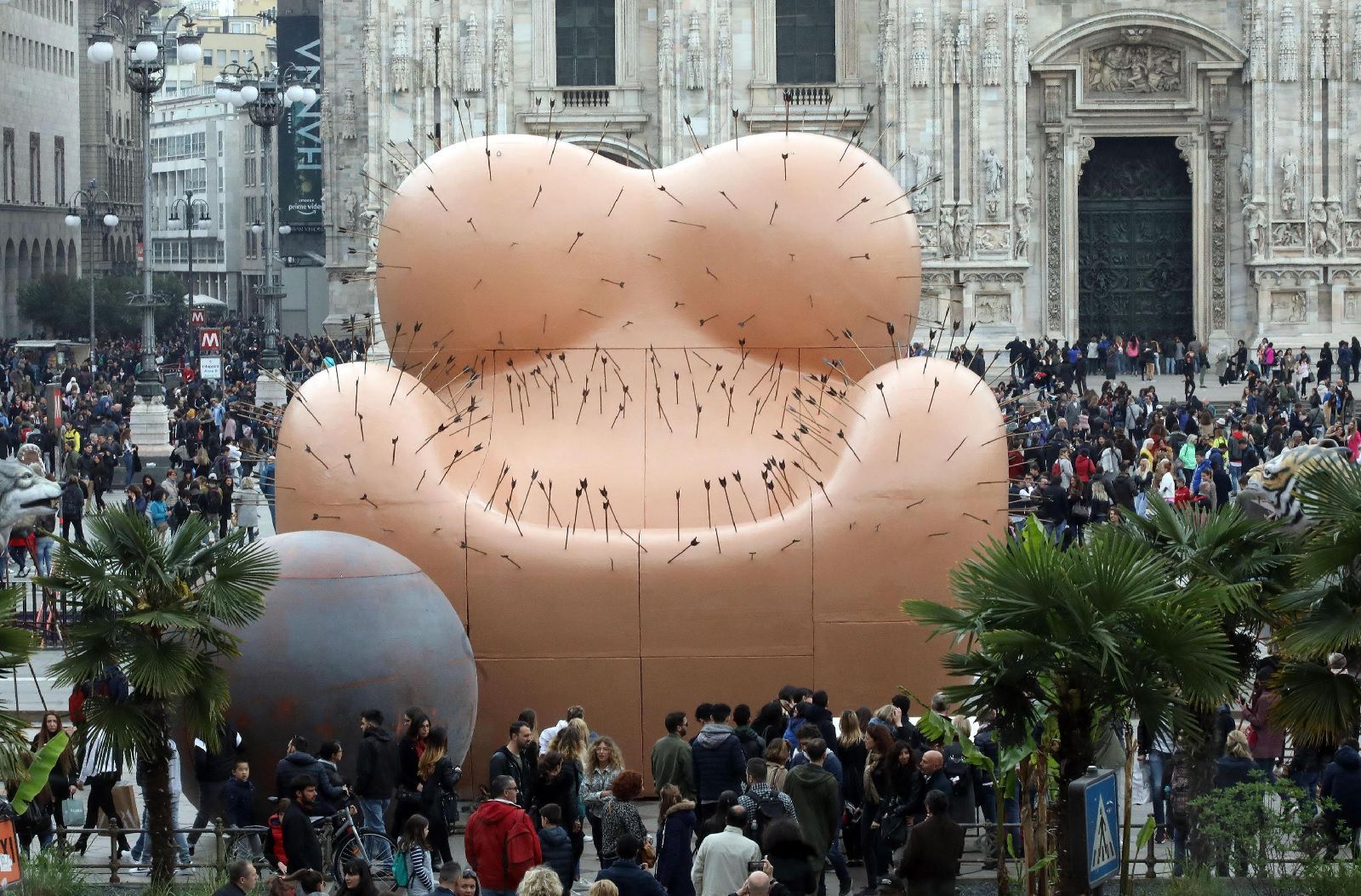 Per la MDW, Gaetano Pesce rielabora la sua famosa UP 5&6, una poltrona ispirata al corpo di una donna disegnata nel 1969 per C&B (ora B&B). Quando fu presentata per la prima volta questo particolare oggetto presentava due qualità innovative: era venduta sottovuoto e, cosa più importante, era il primo prodotto di design italiano ad avere un significato politico e sociale, era emblema della donna costretta a vivere in secondo piano, ancorata e limitata da un mondo governato da uomini. Nella nuova versione la poltrona diventa una monumentale struttura di poliuretano espanso con rivestimento in vetroresina, alta 8 metri e trafitta da 400 frecce che ricordano i numerosi abusi subiti dalle donne nel corso dei secoli. L'originario poggiapiedi di forma sferica è ora sostituita da una grossa palla che ricorda quella un tempo attaccata ai piedi dei prigionieri, mentre le sei teste di belve feroci enfatizzano la crudeltà dell'uomo. Il lavoro di Pesce che troneggia davanti al Duomo è, da quando è stato inaugurato il 7 aprile, al centro di numerose polemiche. Il pubblico è, infatti, diviso tra chi apprezza la provocazione dell’artista, chi reputa la violenza nei confronti delle donne un tema troppo delicato ed importante per venire rappresentato da un oggetto così superficiale e chi pensa che la poltrona deturpi il paesaggio della piazza.