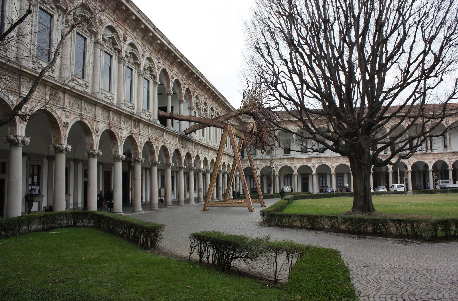 Tra la fine di ottobre e l’inizio di novembre 2018 un’ondata di maltempo e un vento che soffiava a duecento chilometri orari hanno distrutto 12 milioni di alberi lungo l’intero arco alpino. Tra questi anche la foresta di Paneveggio, in Trentino, conosciuta anche come la foresta di Stradivari, poicè il celebre liutaio era sceglieva tra questi abeti rossi il legno da trasformare nei suoi pregiati violini. Piuarch e Nemo Monti hanno scelto di omaggiare questa risorsa naturale perduta con un’installazione intitolata proprio La foresta dei Violini. Il risultato sono dei tronchi d’albero con le radici sospese nel vuoto sorrette da un grande cavalletto architettonico realizzato in abete rosso. La struttura è la rappresentazione dell’architettura e dovrebbe rievocare la capacità della natura stessa di parlare all’umanità. L’installazione si trova fino a venerdì 19 aprile nel Cortile d’Onore dell’Università Statale di Milano in occasione dell'evento Human Spaces.