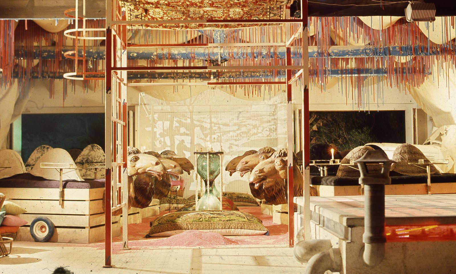 La mostra segue un percorso cronologico che prende avvio con le discoteche degli anni Sessanta, che per la prima volta trasformano il ballo in un rito collettivo da officiare in un mondo fantastico fatto di luci, suoni e colori in cui immergersi. Vi sono i luoghi della subcultura newyorchese, quali l’Electric Circus (1967), progettato dall’architetto Charles Forberg e dal famoso studio Chermayeff & Geismar, che con il suo carattere multidisciplinare influenzò anche i club europei, tra cui lo Space Electronic a Firenze (1969) concepito dal collettivo Gruppo 9999, une delle discoteche nate dalla collaborazione con i protagonisti dell’Architettura Radicale italiana. Tra questi si annoverava anche il Piper (1966) di Torino, lo spazio multifunzionale concepito da Giorgio Ceretti, Pietro Derossi e Riccardo Rosso, che con i suoi mobili modulari non solo faceva ballare, ma si prestava ottimamente anche per concerti, happening e teatro sperimentale. Il Bamba Issa (1969), una discoteca toscana sulla spiaggia di Forte dei Marmi ideata dal Gruppo UFO, era essa stessa un teatro dell’arte: qui tutto l’interior fungeva da palcoscenico. Nei tre anni di esistenza, ogni estate veniva trasformata secondo un nuovo tema.