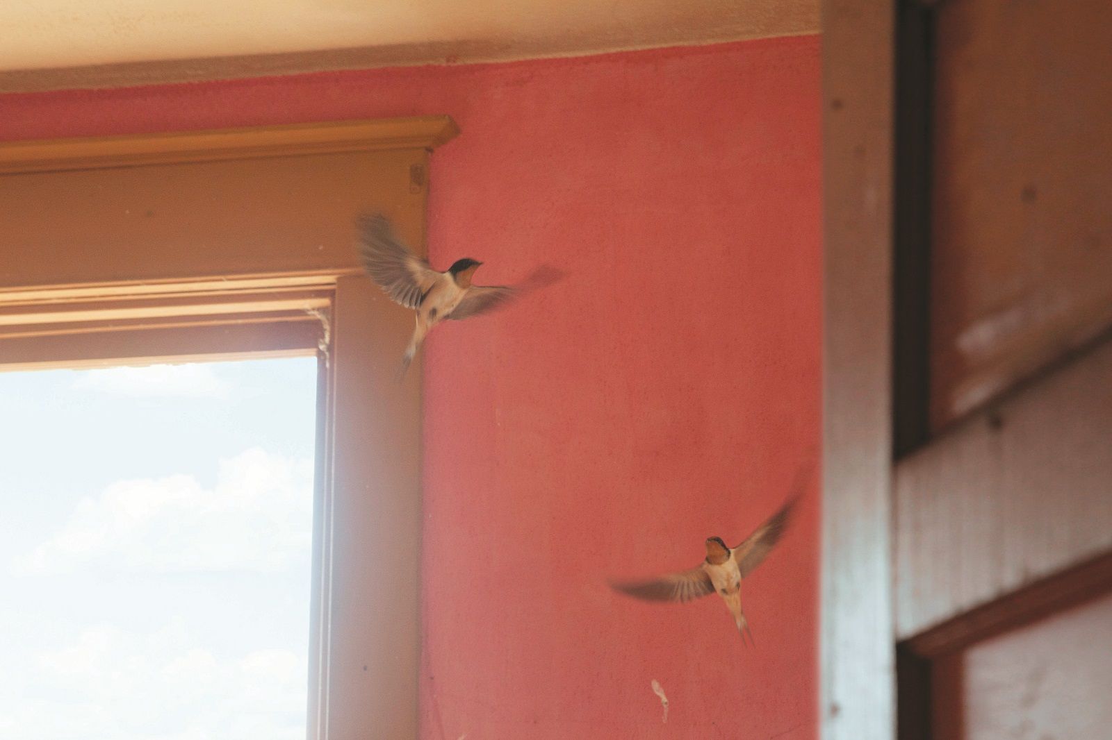 In Bird’s Nest, il volo di due rondini dentro una stanza vuota suggerisce una vita intima e naturale che continua a dispetto della desolazione che la circonda.
