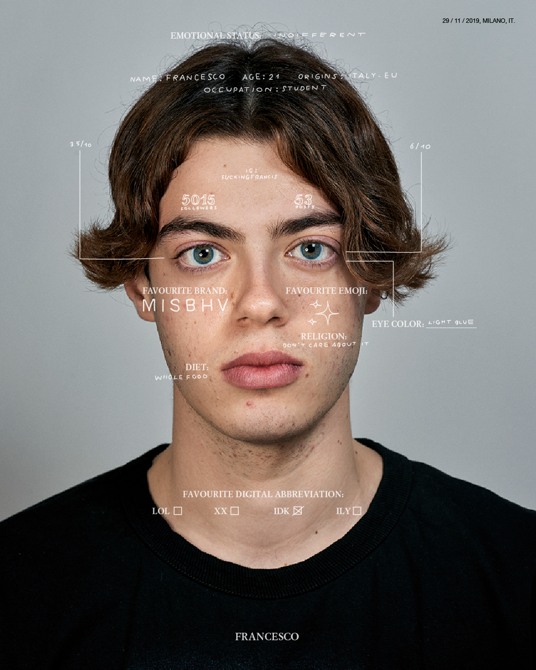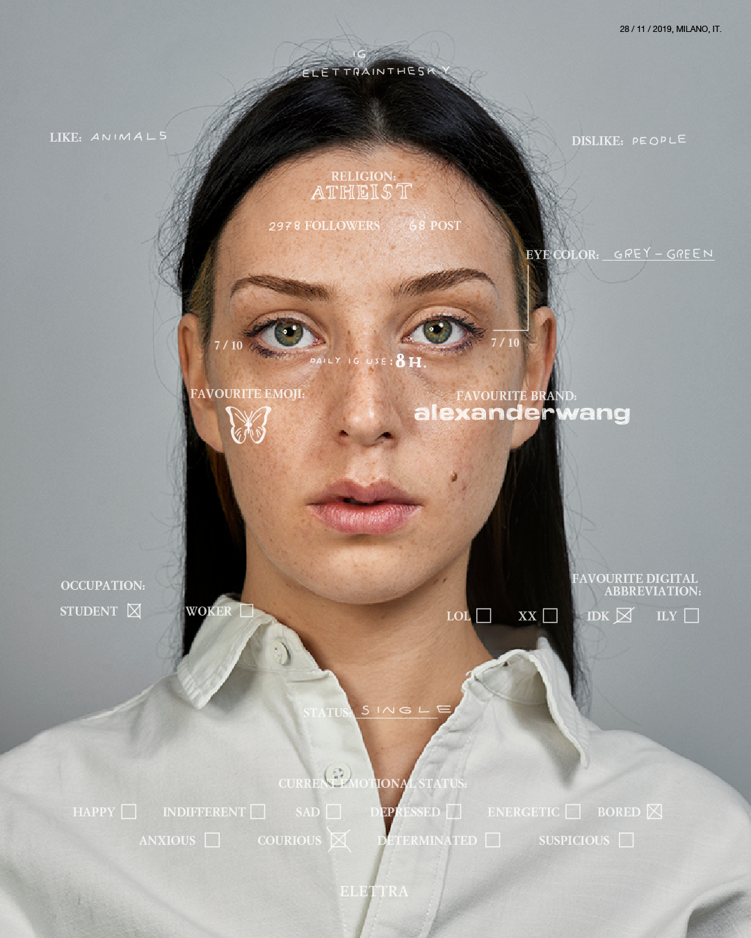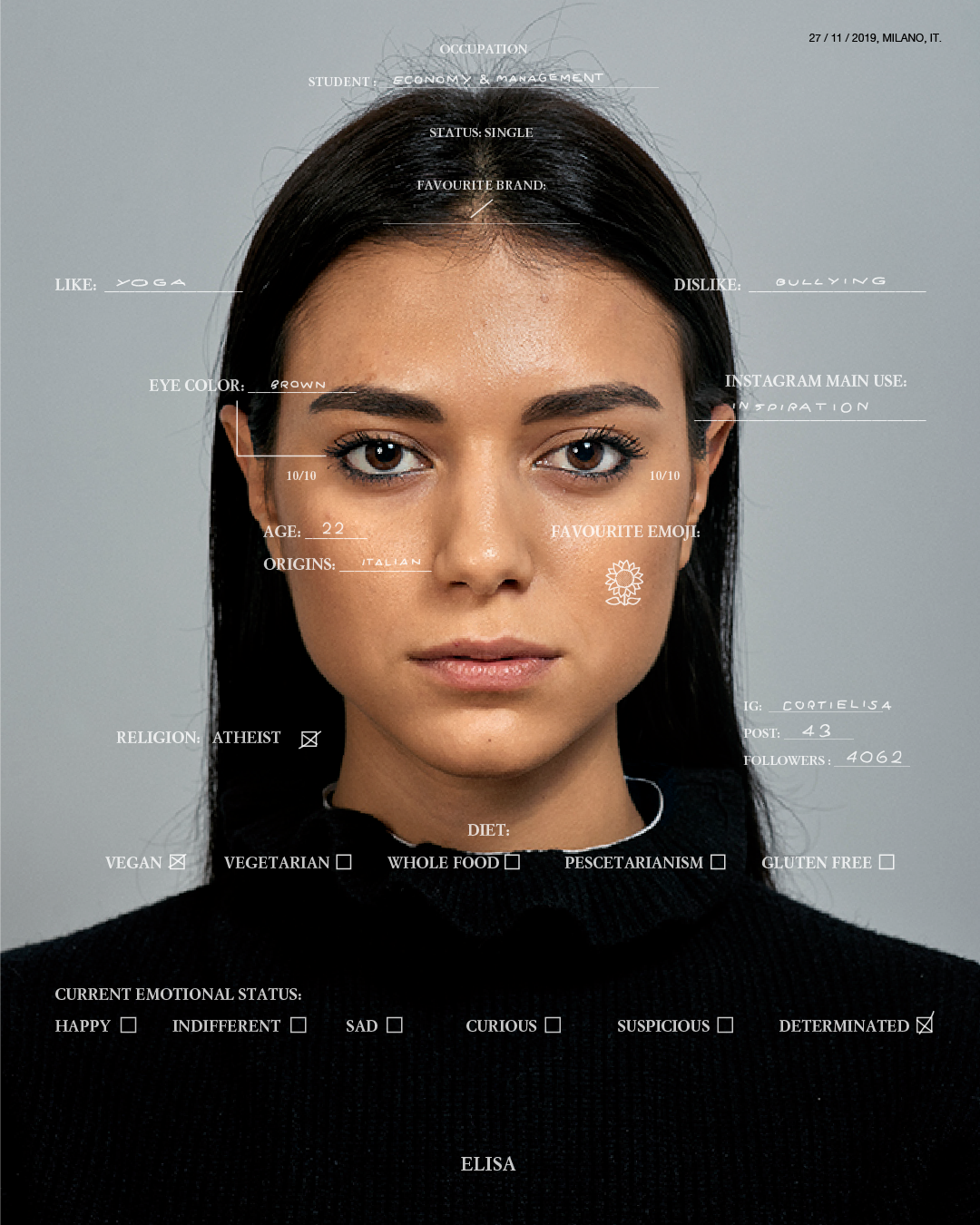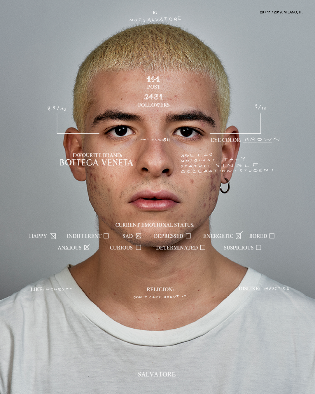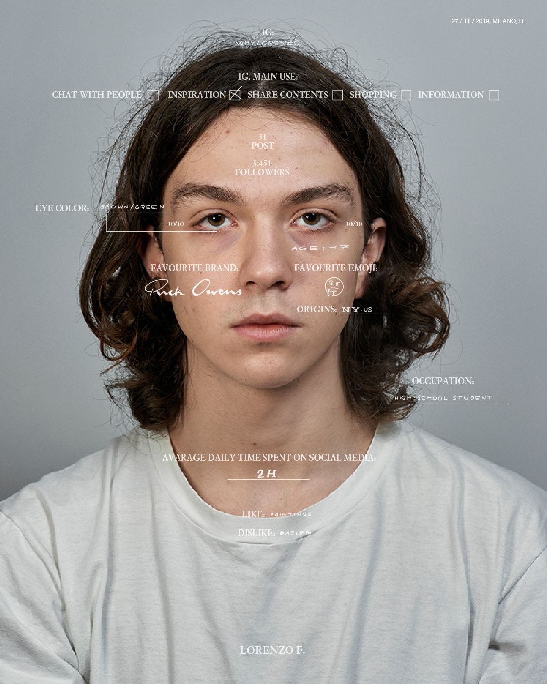 Di sicuro lo studiare un gruppo specifico di giovani adulti contemporanei. Sono loro il carburante del futuro e una rappresentazione trasparente dell'intera società contemporanea. Di conseguenza, forse la fase più interessante di questo progetto è stata il questionario iniziale, che abbiamo chiesto ai modelli di compilare quando sono arrivati in studio. Era un modo di conoscere il coinvolgimento personale di ciascuno. C'erano varie domande sulla vita reale e digitale, ed è stato interessante vedere la combinazione di memoria, carte d'identità e telefoni che utilizzavano per rispondere a tutte queste domande.
