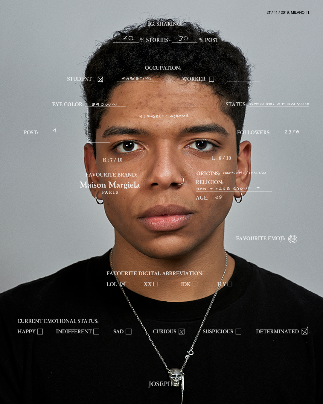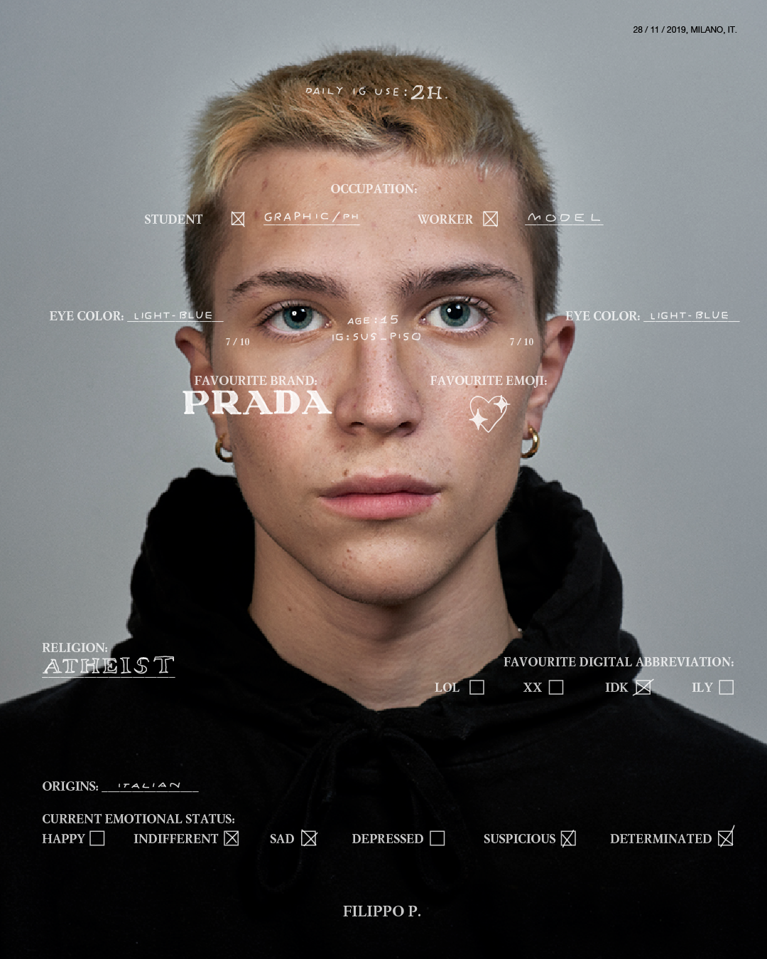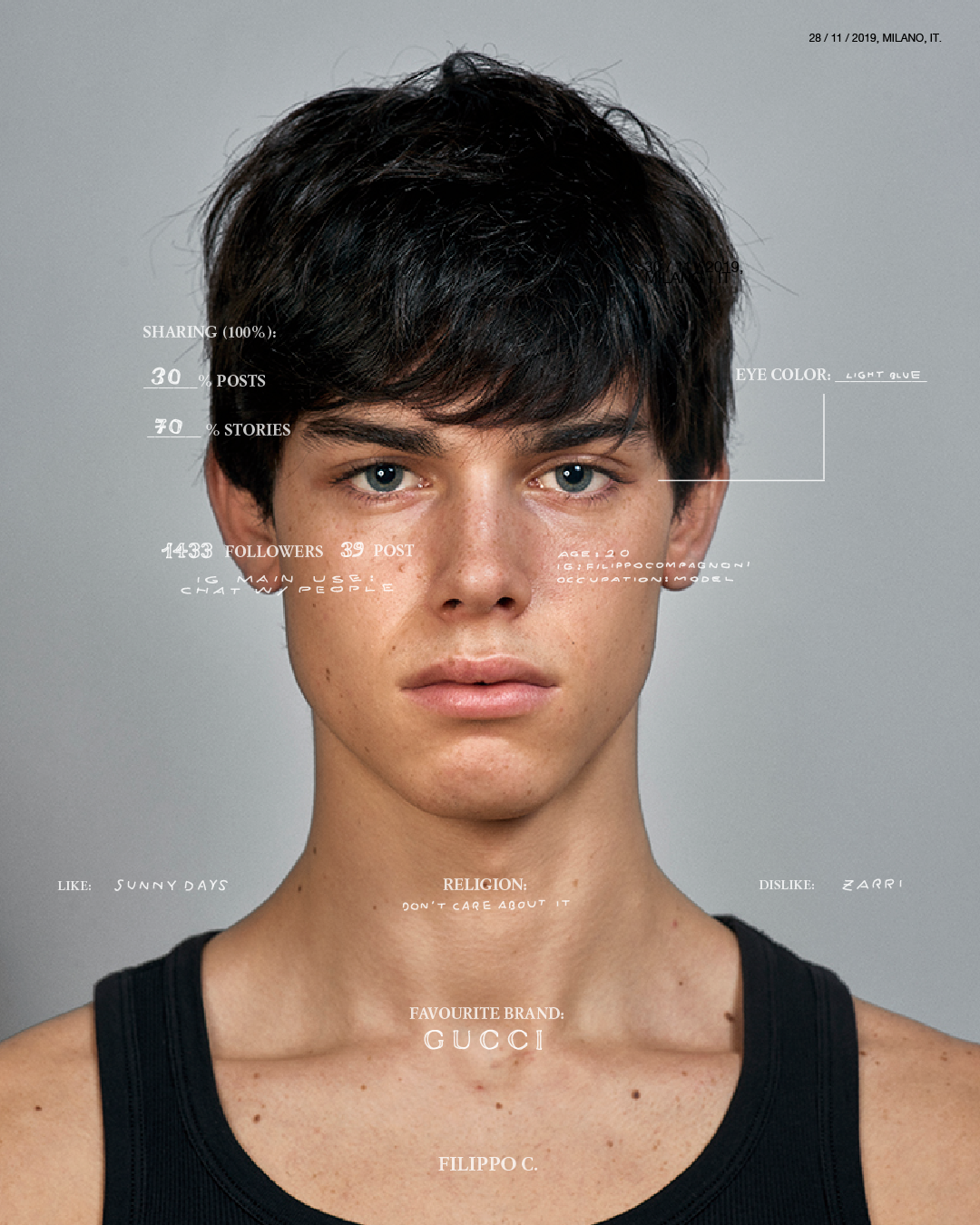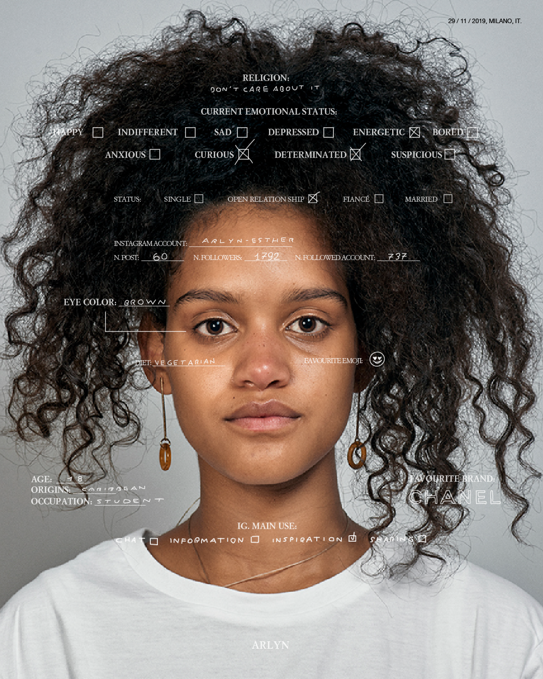 Di sicuro lo studiare un gruppo specifico di giovani adulti contemporanei. Sono loro il carburante del futuro e una rappresentazione trasparente dell'intera società contemporanea. Di conseguenza, forse la fase più interessante di questo progetto è stata il questionario iniziale, che abbiamo chiesto ai modelli di compilare quando sono arrivati in studio. Era un modo di conoscere il coinvolgimento personale di ciascuno. C'erano varie domande sulla vita reale e digitale, ed è stato interessante vedere la combinazione di memoria, carte d'identità e telefoni che utilizzavano per rispondere a tutte queste domande.