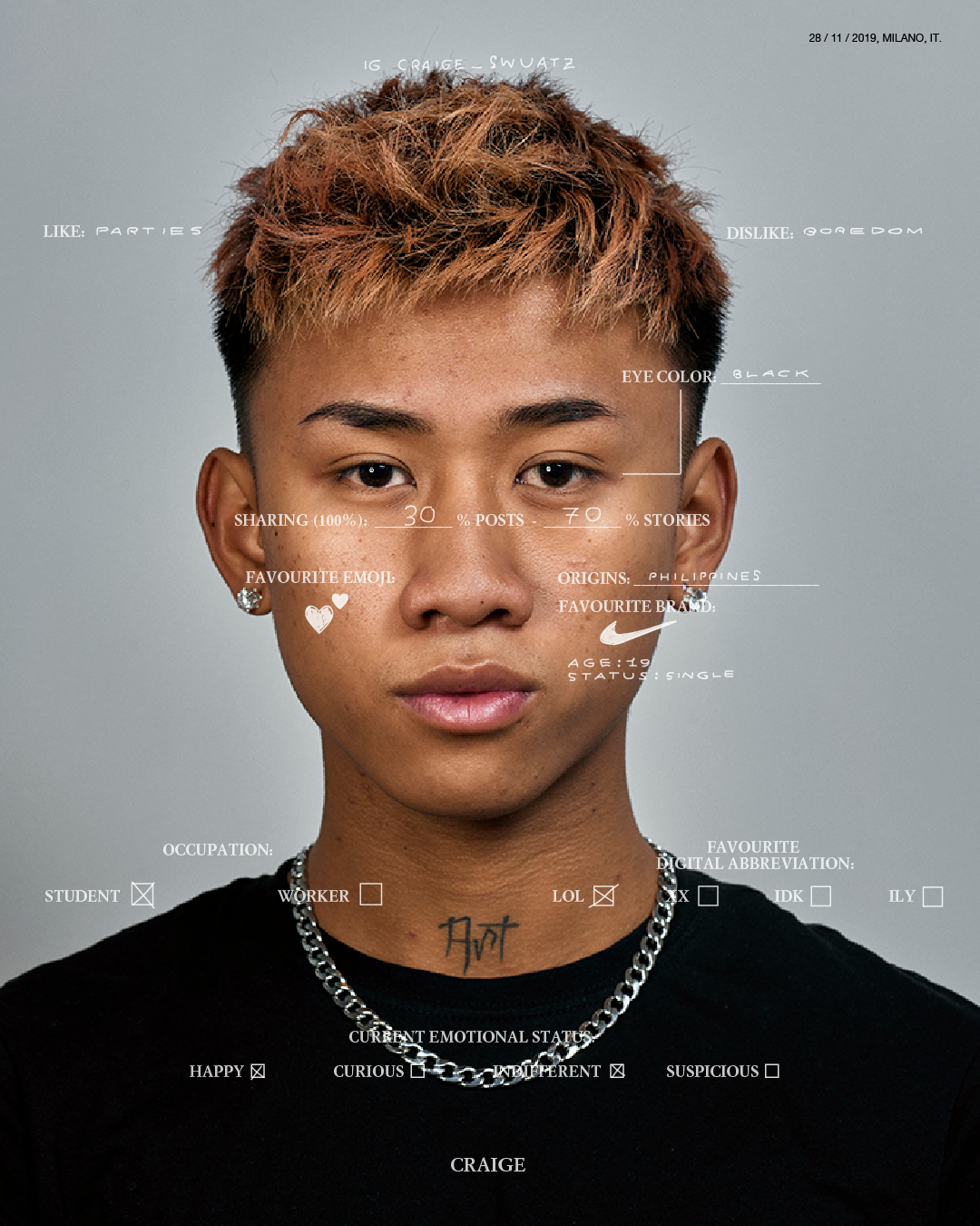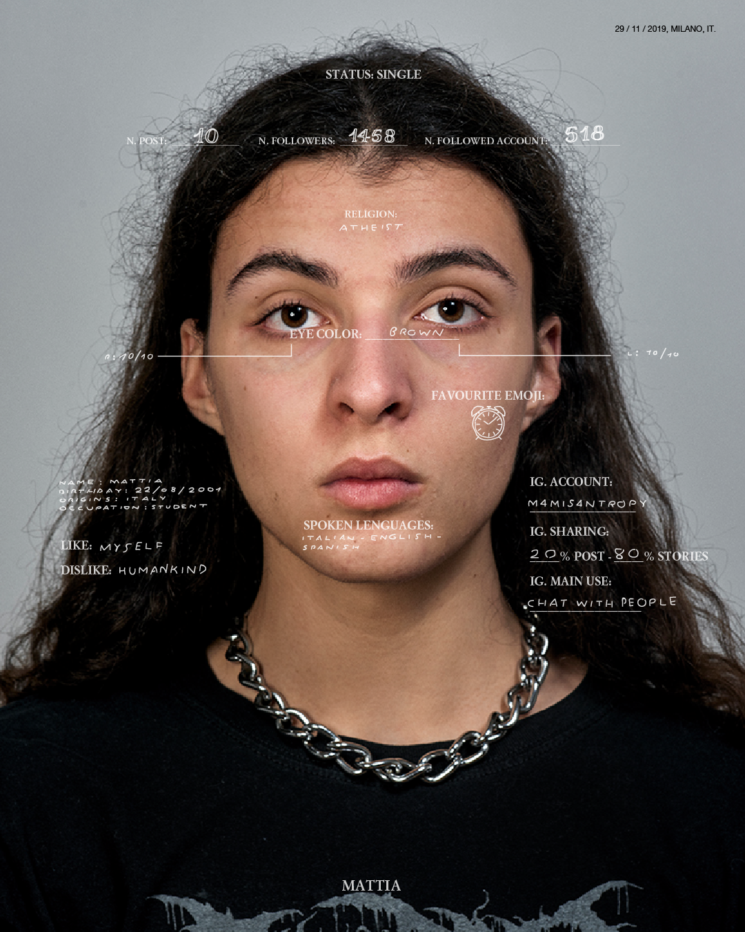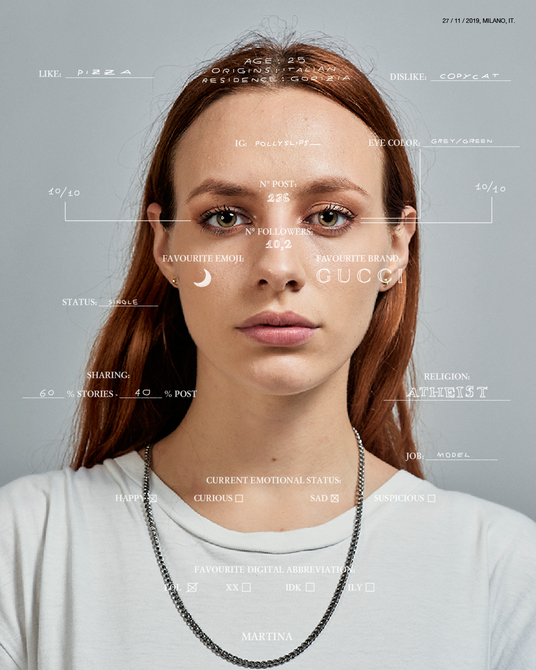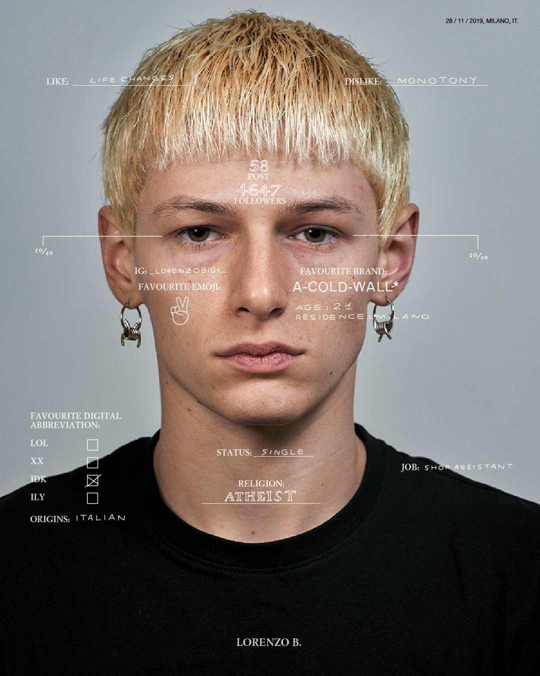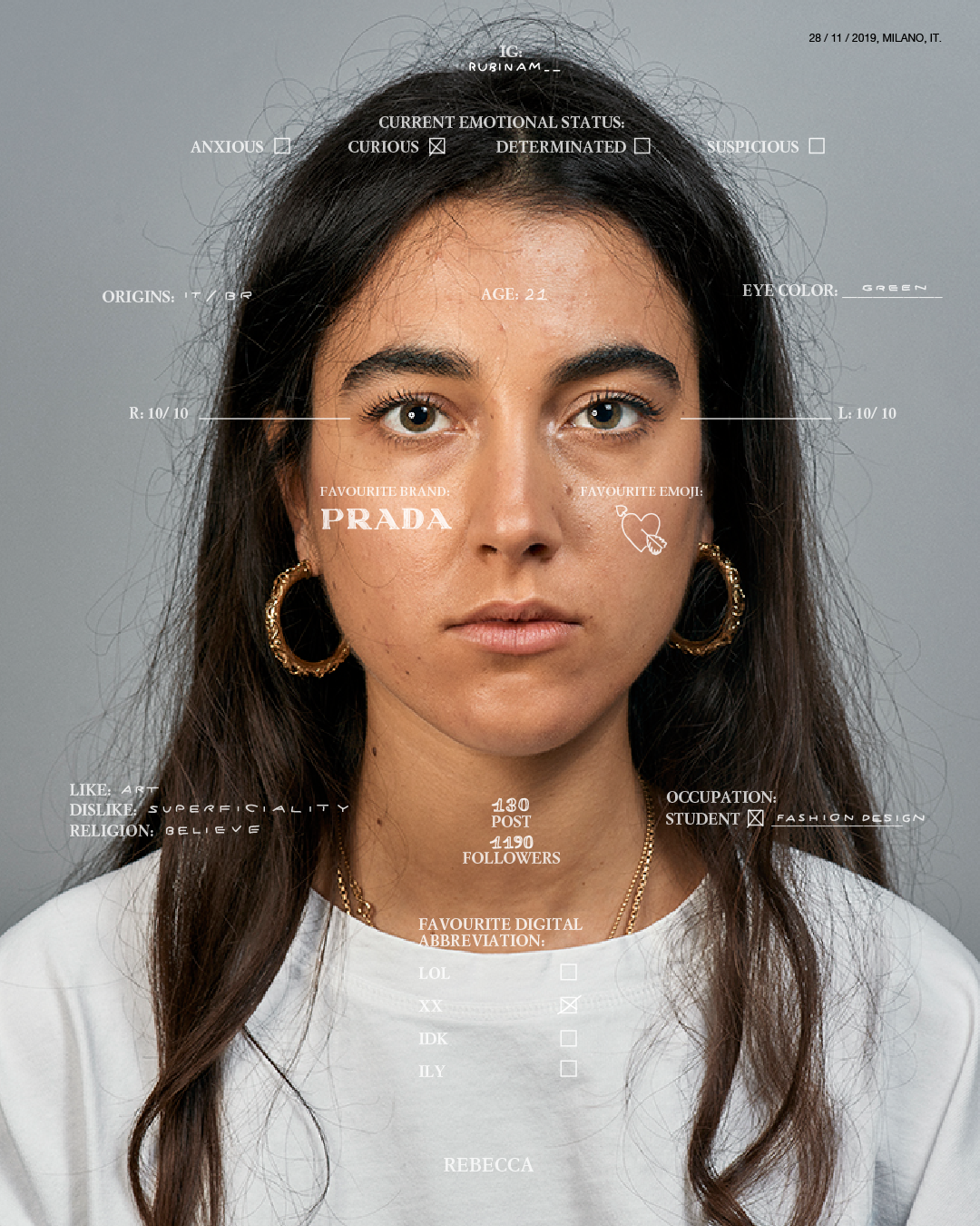 Di sicuro lo studiare un gruppo specifico di giovani adulti contemporanei. Sono loro il carburante del futuro e una rappresentazione trasparente dell'intera società contemporanea. Di conseguenza, forse la fase più interessante di questo progetto è stata il questionario iniziale, che abbiamo chiesto ai modelli di compilare quando sono arrivati in studio. Era un modo di conoscere il coinvolgimento personale di ciascuno. C'erano varie domande sulla vita reale e digitale, ed è stato interessante vedere la combinazione di memoria, carte d'identità e telefoni che utilizzavano per rispondere a tutte queste domande.
