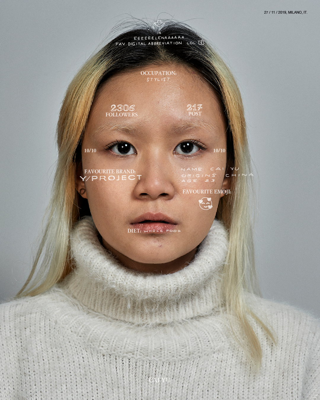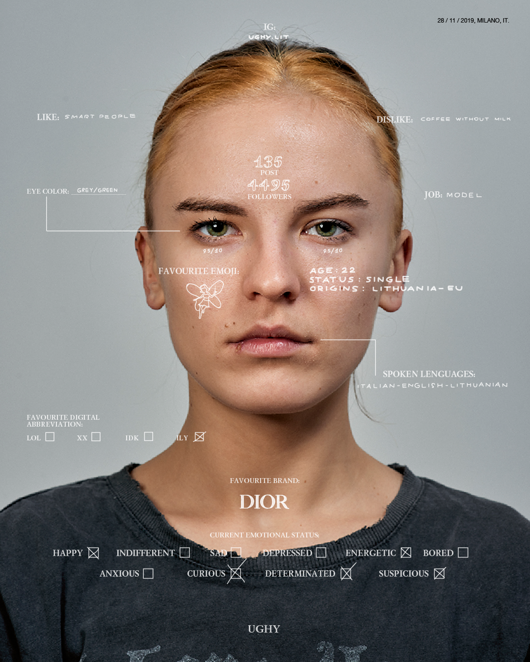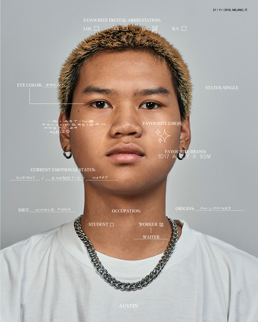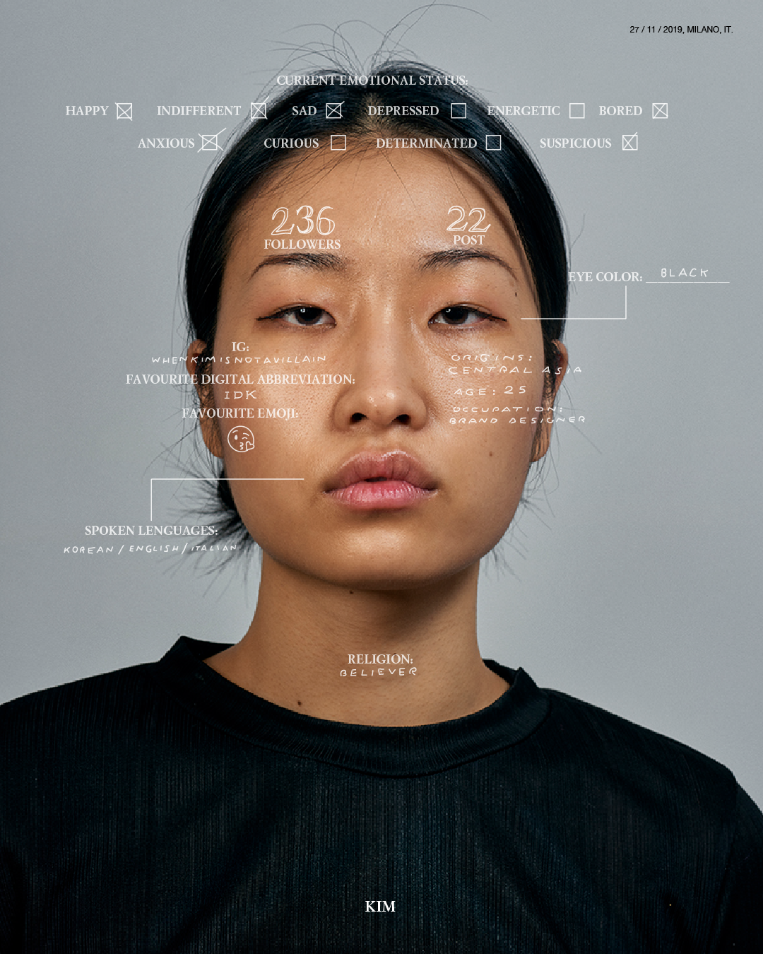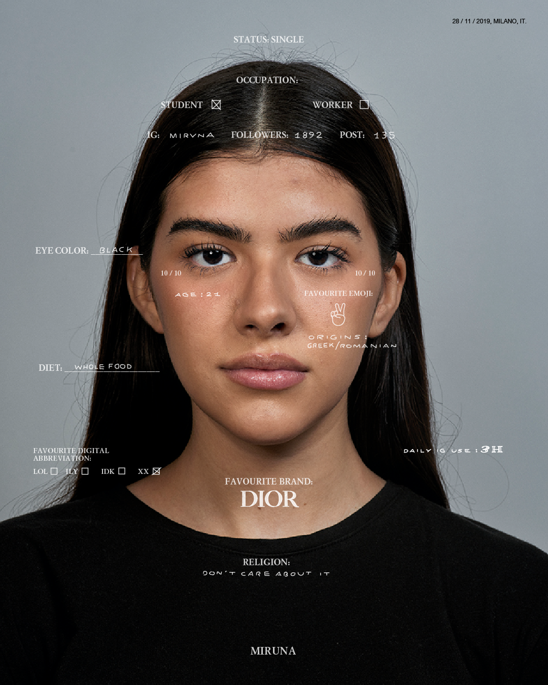 Di sicuro lo studiare un gruppo specifico di giovani adulti contemporanei. Sono loro il carburante del futuro e una rappresentazione trasparente dell'intera società contemporanea. Di conseguenza, forse la fase più interessante di questo progetto è stata il questionario iniziale, che abbiamo chiesto ai modelli di compilare quando sono arrivati in studio. Era un modo di conoscere il coinvolgimento personale di ciascuno. C'erano varie domande sulla vita reale e digitale, ed è stato interessante vedere la combinazione di memoria, carte d'identità e telefoni che utilizzavano per rispondere a tutte queste domande.