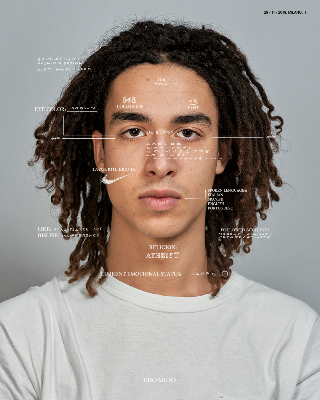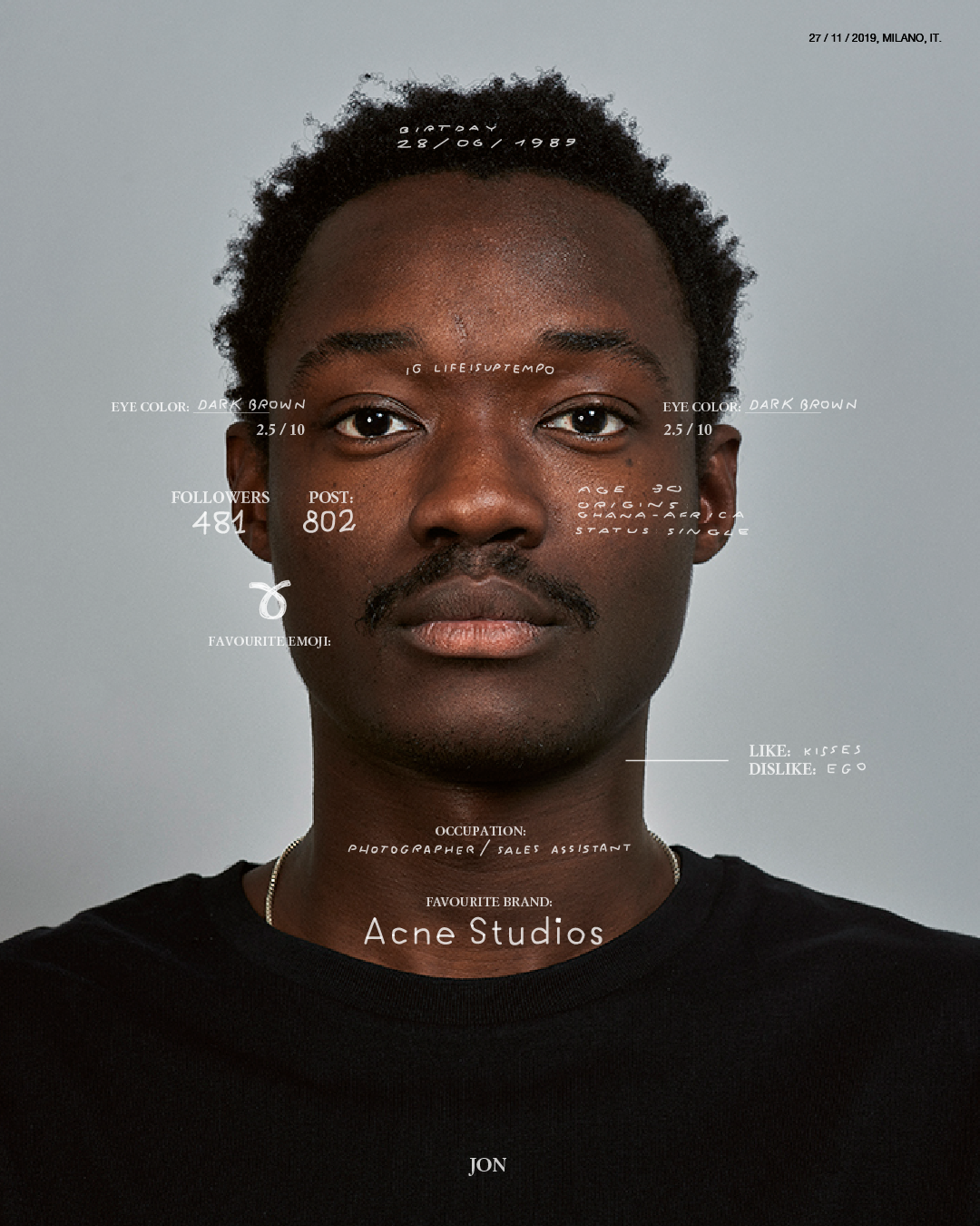 Con una serie di immagini scattate dal fotografo Paolo Prendin nella forma di una carta d'identità o di una foto di passaporto, un casting milanese di Kikiesse Casting e un Manifesto di Willy Ndatira, la serie di foto pone la domanda se dei completi estranei possano rispondere a domande esistenziali su chi siamo, cosa ci rende felici e cosa vogliamo dalla vita, attraverso il giudizio delle nostre personalità digitali. nss magazine ha scambiato due parole con l'artista per un'ulteriore visione del progetto e del concetto.