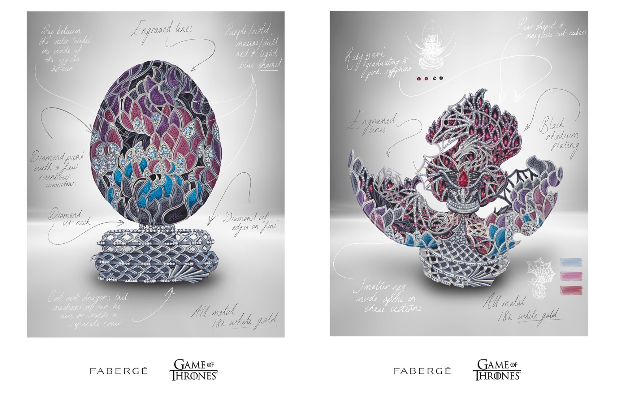 L’uovo sarà realizzato entro la fine del 2021 dagli artigiani di Fabergé, a Londra, possiederà una struttura di oro bianco da 18 carati e nel corso di questi mesi le gemme verranno attentamente tagliate e assemblate. La sua struttura non è solo un rimando a Game of Thrones ma anche alla storia delle originali Uova Fabergé: della collezione originale, infatti, un uovo possedeva una corona di rubino che appariva aprendolo; mentre un altro possedeva una struttura a forma di pigna che è molto simile a quella “a scaglie” del modello in produzione adesso.