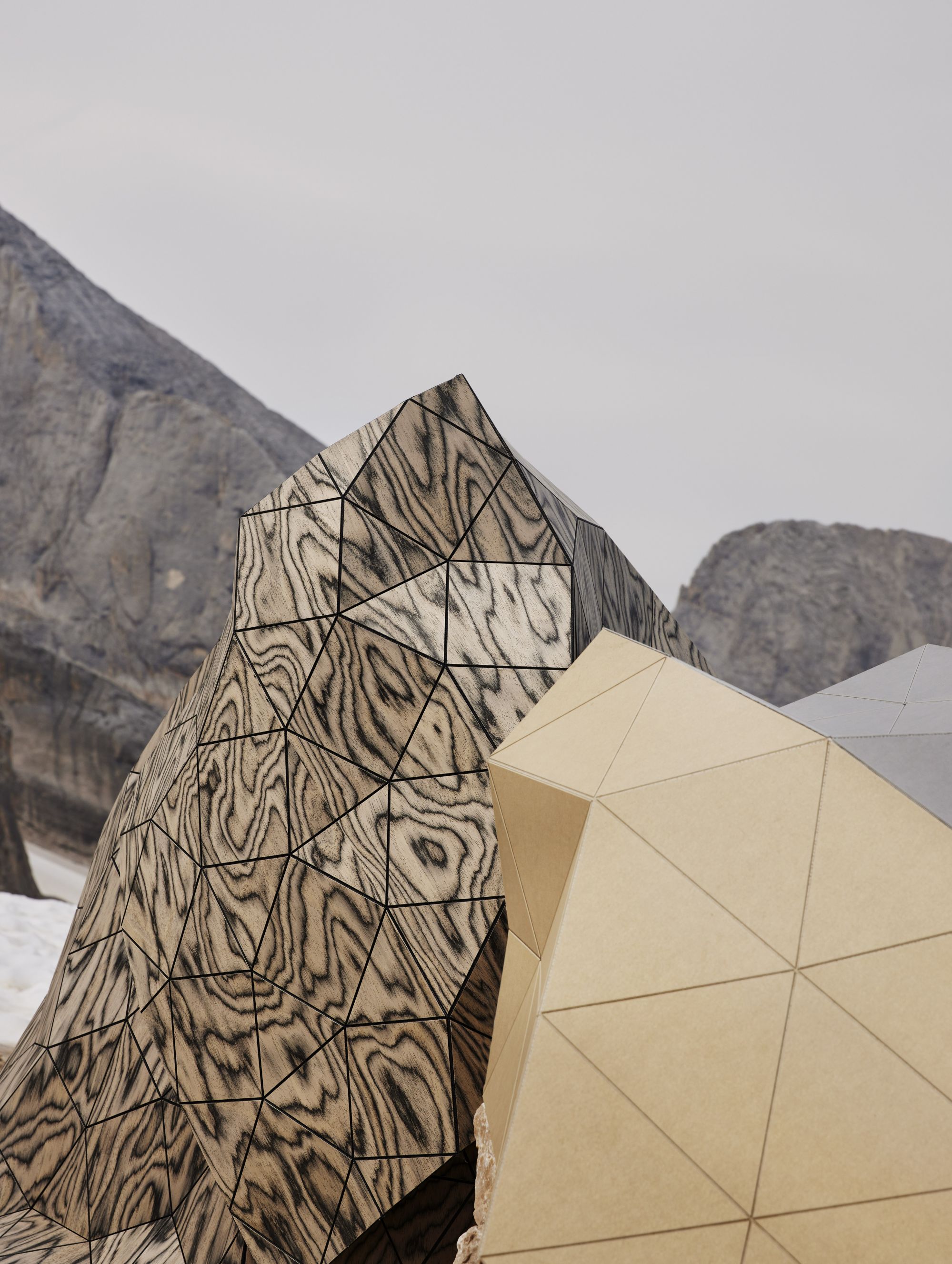 Il profilo dei pavimenti rocciosi accoglie i fogli di rivestimento che si amalgamano con le vette innevate dai riflessi opalescenti, le geometrie dei Mesh non usurpano il paesaggio naturale, ma ne esaltano le forme in un’unione dalle atmosfere lunari. Un design sempre in armonia con gli spazi che incontra, naturali o antropici che siano.