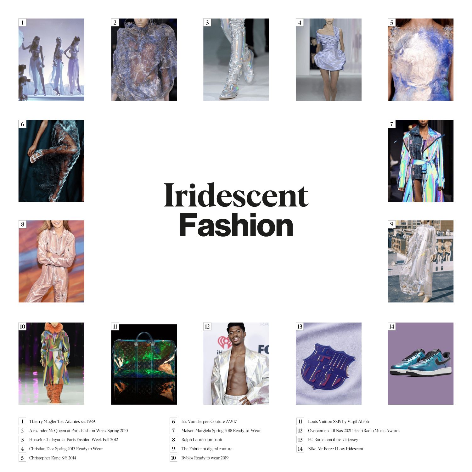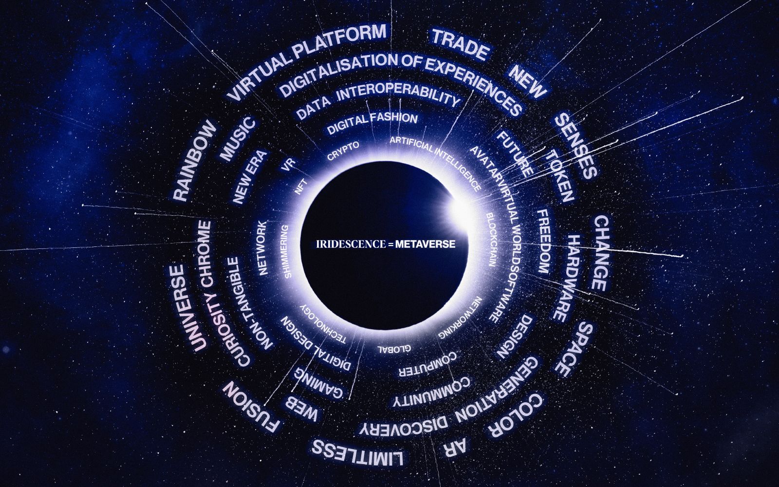 L'iridescenza non è un colore ma un proprietà ottica che contiene in sé tutto lo spettro dei colori esistenti, che variano in base all'ambiente e al punto di osservazione. Questo concetto è estremamente affine a quello del Metaverso, un mondo multiforme e multistrato dove la realtà è a disposizione dell'utente. Il settore del gaming è l'industria che sta trainando il settore del virtuale, aprendo porte e sperimentando prodotti e nuove abitudini di consumo digitale. Partendo proprio dalla moda, che si sta affacciando in questi mesi in un nuovo mercato è interessante notare come l'iridescente sia sempre stato storicamente associato all'idea di futuro o moda futurista. Non è un caso quindi che molti dei primi vestiti digitali siano iridescenti, strizzando l'occhio anche al personalizzazione digitale, ipotizzando un futuro distopico in cui ogni utente vede un item diverso a seconda dei gusti. L'arte contemporanea è insieme al gaming e alla moda, il settore che più sta contribuendo alla generazione di questa estetica, grazie al boom degli NFT e della tecnologia blockchain.