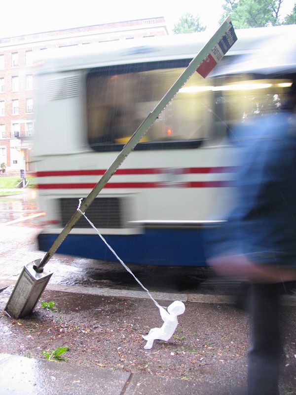 The urban theater and the theatricalism of everyday life. These are two of the themes that Mark Jenkins treats in his pieces of street art. His pvc mannikins have human features and real clothes and you can find them sleeping in a dustbin, reading on the groundfloor or in equilibrium on the top of a building. He aims to astonish you, to make your head turn around and to slow down your run: are they real? Are they telling me something? Yes, they are telling you to remember that for some kind of people a marginal life is an invisible habit.