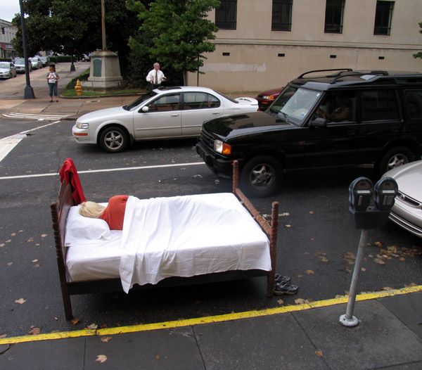 Il teatro urbano e la teatralità del quotidiano. Sono due degli aspetti su cui l'artista americano Marc Jenkins punta a farriflettere specularmente. ''Incontrare'' una delle sue opere da strada vuol dire imbattersi in fantocci di pvc di altezza e fattezze umane, ricoperti di vestiti veri, intenti a compiere le più banali attività della più normale delle giornate infrasettimanali. Solo che loro schiacciano un pisolino su un'amaca arrangiata tra due pali delle luce oppure in un comodo cassonetto dei rifiuti, rigorosamente per la raccolta differenziata della plastica. Qualcun'altro legge, invece, il giornale sdraiato per terra ed è esso stesso totalmente rivestito di pagine di quotidiani ormai da buttare, c'è poi chi si abbevera con il busto immerso in enormi fontane e chi tenta di rimanere in equilibrio sulla cima di un palazzo.