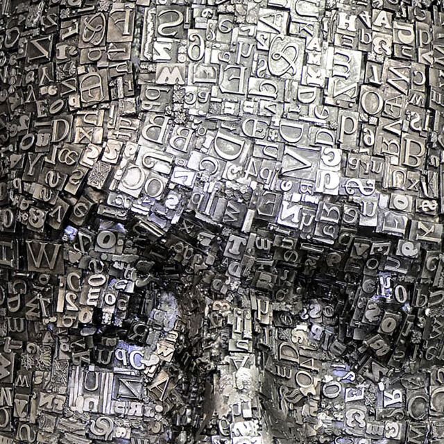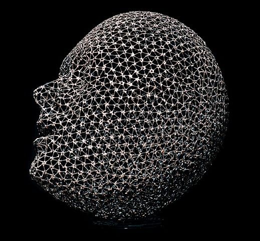The artist's figurative sculptures, in metal and steel fasteners, are contained within a single concept: a form intricate egg-shaped, streamlined, androgynous, with no details. Head seen as the only foundation of perception of a mirror of experience.