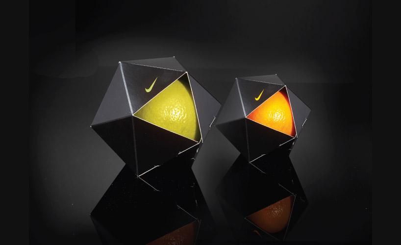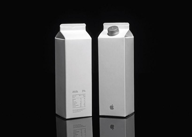 Intanto, qui il lavoro di design è efficace e ben eseguito, riprendendo colori e motivi dei brand nei minimi dettagli, ma anche ispirazioni di forma: il cartone degli agrumi Nike a triangolo richiama infatti le geometrie del logo e dei prodotti in generale, come quelle del cartone del latte ricordano l'essenzialità e l'estica minimal del design Apple.