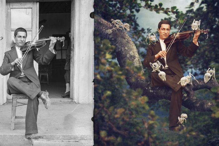Il risultato di questo “restauro digitale” è la serie Dancing with Costică, in cui vengono messi a confronto gli scatti originali di Acsinte e le immagini trasformate da Long, quasi sempre in contesti surreali e onirici: “Volevo ridare vita a quelle foto” spiega Long “ma più di tutto volevo dare loro una storia. Volevo che le persone riconoscessero nei soggetti fotografati delle persone reali, non solo delle vecchie fotografie. Aggiungere i colori cambia completamente la percezione di un’immagine".
