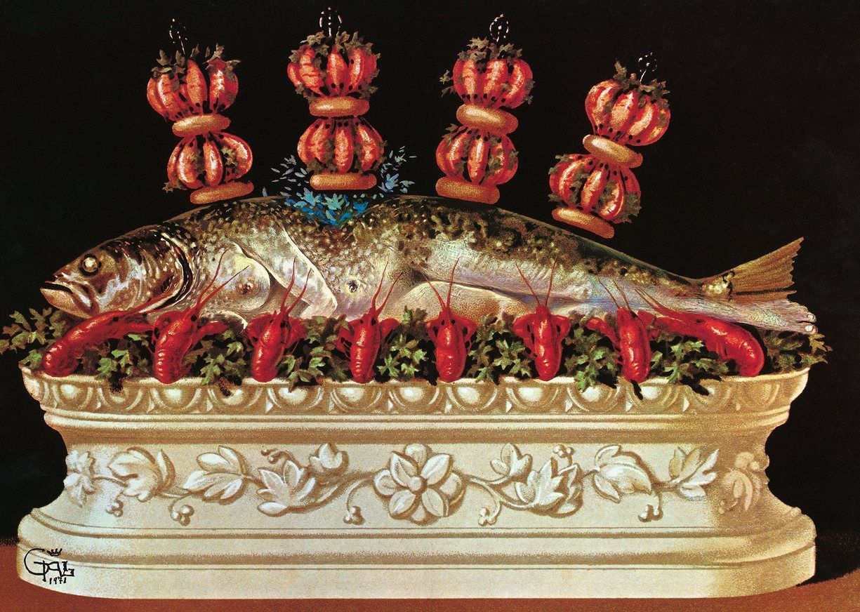 In molti casi si tratta di piatti rubati alla tradizione culinaria francese e serviti (in alcuni casi, tuttora) in storici ristoranti parigini – Lasserre, La Tour d’Argent, Le Train Bleu – a cui Dalì e Gala aggiungevano un twist sensuale ed estroso e che spesso servivano agli ospiti in occasione dei loro sfarzosi banchetti. Non mancano infatti neanche battute ed osservazioni del pittore, perfette per una leggera conversazione davanti ad un piatto dal sapore esotico.
