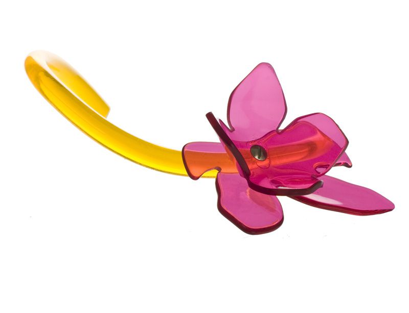 “Porto dentro di me i colori vibranti e struggenti delle tele di Gaugin” dice Serena Bosone. Appassionata di storia dell’arte, Serena ritrova quei colori nei suoi numerosi viaggi per trasferirli nelle sue creazioni. Se l’ispirazione arriva da civiltà lontane e incontaminate e dalla ricerca della bellezza dei grandi pittori e pensatori del passato, la materia prima proviene dal futuro. Nell’ultima collezione Binglabangles queste evocative sfumature esplodono sul plexiglass trasformando un materiale sintetico e freddo in poetiche suggestioni. Frida Khalo, le donne giraffa della Birmania, il caleidoscopio cromatico della foresta amazzonica, le piume degli indios, le foglie a ombrello. Ma anche i bauli colmi di stoffe fiorite che viaggiavano a bordo delle navi inglesi verso le indie occidentali. Tutto questo, più un pizzico di fantasia, è Binglabangles.