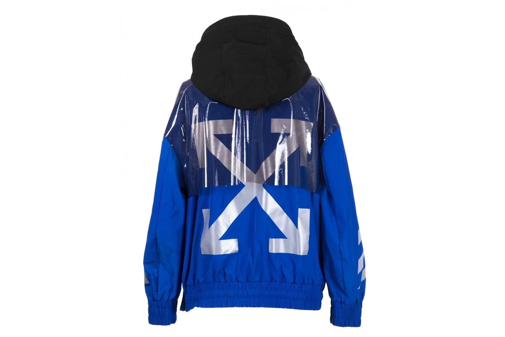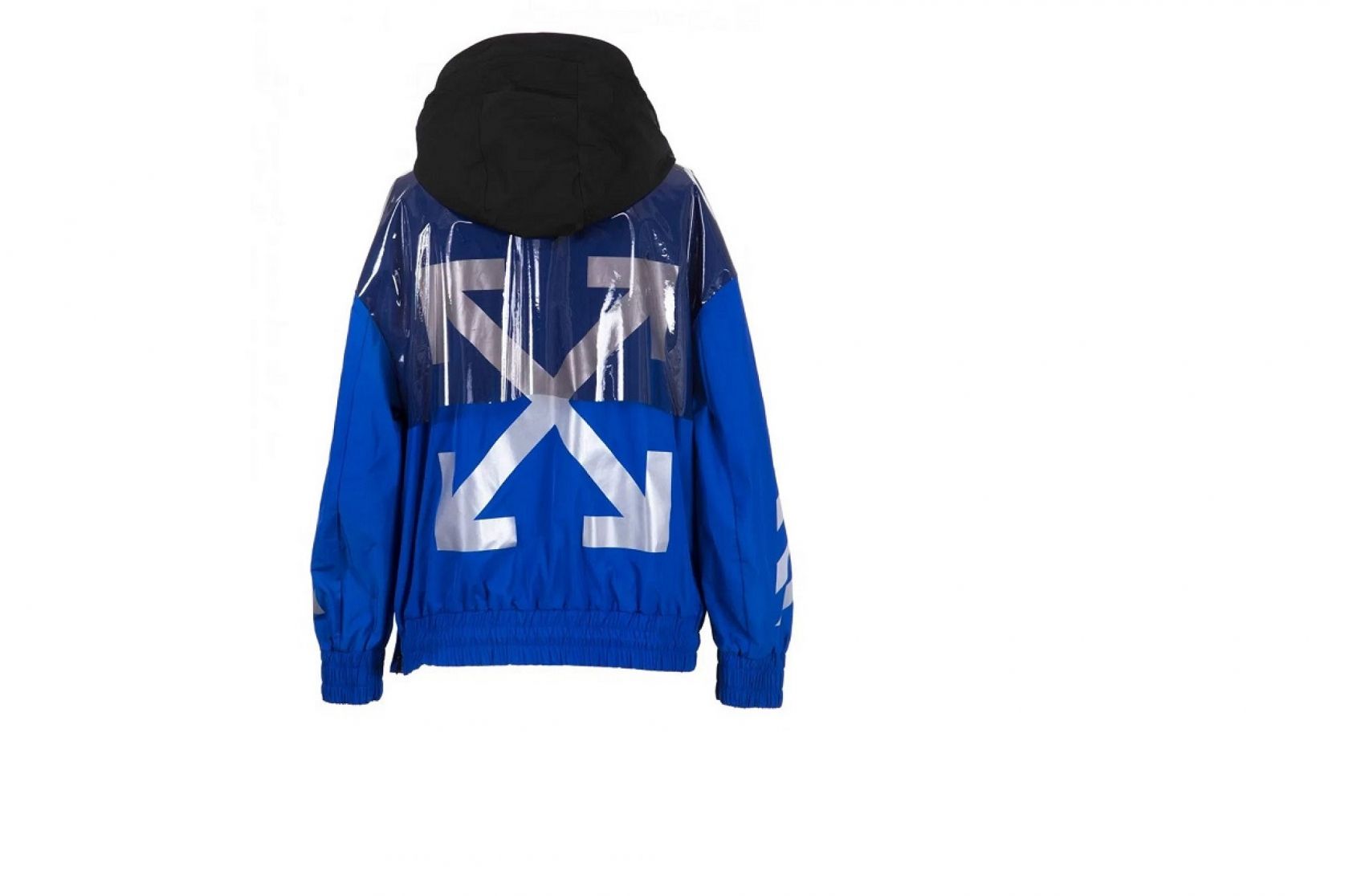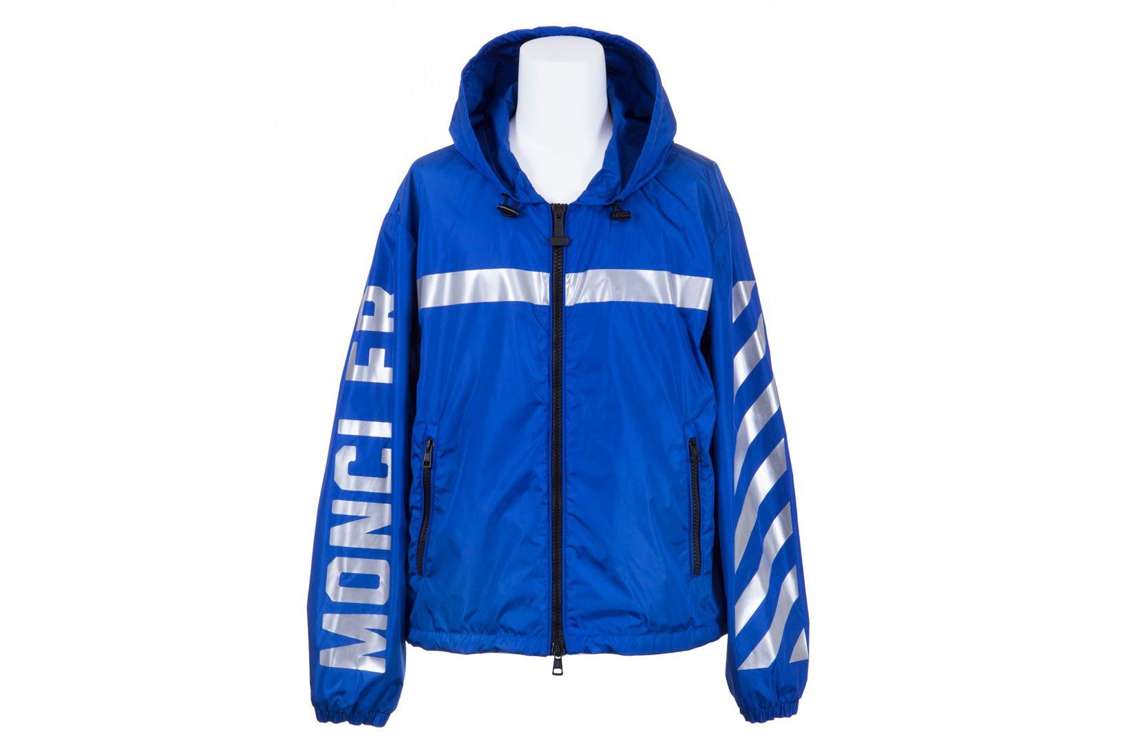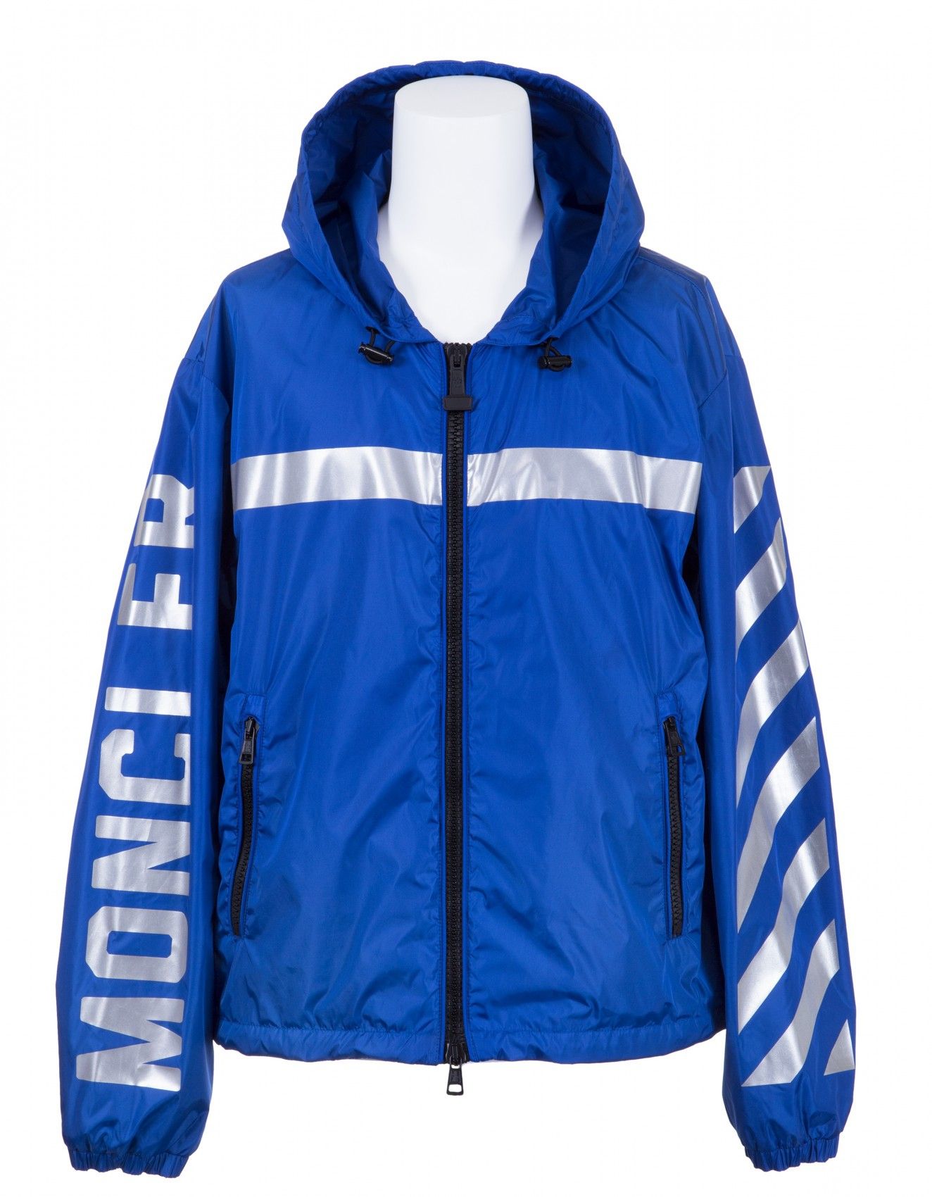 Il piumino leggero ha due tasche sul petto, il logo Moncler in arancione e la stampa OFF-WHITE sul retro in color argento. Entrambi, la giacca a vento con cappuccio e il pullover, sono disponibili in un colore blu brillante con i dettagli caratteristici delle label sulla parte posteriore e sulle maniche in silver senza contare che il maglione ha un pannello nero nella metà superiore anteriore e una finitura lucida sulla parte superiore della schiena. Concludono la collezione la tee bianca over con le frecce di Virgil Abloh sulla schiena ed il berretto da baseball blu con il logo arancione di Moncler.