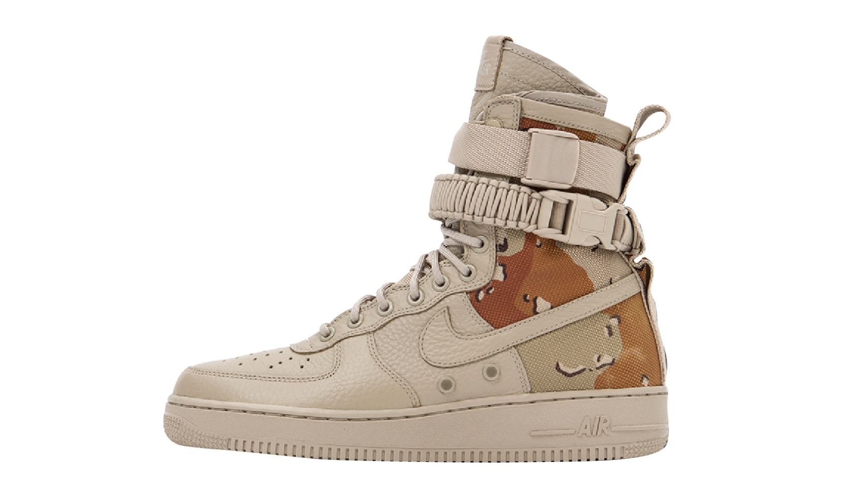 Le Nike SF-AF1 sono le sneakers preferite di molti al momento. Sicuramente si possono considerare come uno splendido risultato di contaminazione stilistica. Possiamo considerare la "contaminazione" e la creazione di sneakers ibride uno dei trend più consistenti quest'anno. Nel presente caso l'ispirazione per queste sneakers, nate dalla geniale creatività di Ben Kirschner, nasce dagli SFB boots, stivali tattici in dotazione all'esercito. Dopo il successo dei precedenti modelli, questa colorway "Desert Camo" è sicuramente un'operazione ben riuscita. I compression strap con fibia tecnica che impreziosiscono la tomaia sono rimasti invariati rispetto al passato. I materiali per questa nuova cw sono invece pelle con texture martellata che presenta un dettaglio camo in canvas con effetto lavato sul retro.