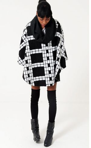Dunque, si parla di “multy-way styling options”, per cui come si può non iniziare dal buon vecchio double face? Il termine è stato ampiamente abusato (pensate solo a quante volte deve averlo nominato Matrota nelle televendite dei piumoni!!!) eppure si tratta di un escamotage stilistico che, se ben concepito, può rivelarsi esteticamente molto piacevole. Il trucco sta nel rendere le due “facce” omogenee”, sia dal punto di vista cromatico che dei tessuti, in modo tale da dare al capo una continuità che lo rende veramente versatile e, quindi, reversibile. Questa cappa proposta da Oops, ad esempio, sintetizza in pieno quanto appena detto. Lo sfondo rimane nero, ciò che cambia è il disegno che prevale o si minimizza a seconda delle occasioni: la grafica geometrica vagamente optical è perfetta per un giro in centro con jeans e scarpe basse, mentre la versione più black ben si presta per il look serale per il quale si potrebbe addirittura azzardare di indossare la cappa e nient’altro, magari con un bel paio di calzini alti alla caviglia come la modella nel lookbook. E poi una cappa non può assolutamente mancare nel nostro armadio!
