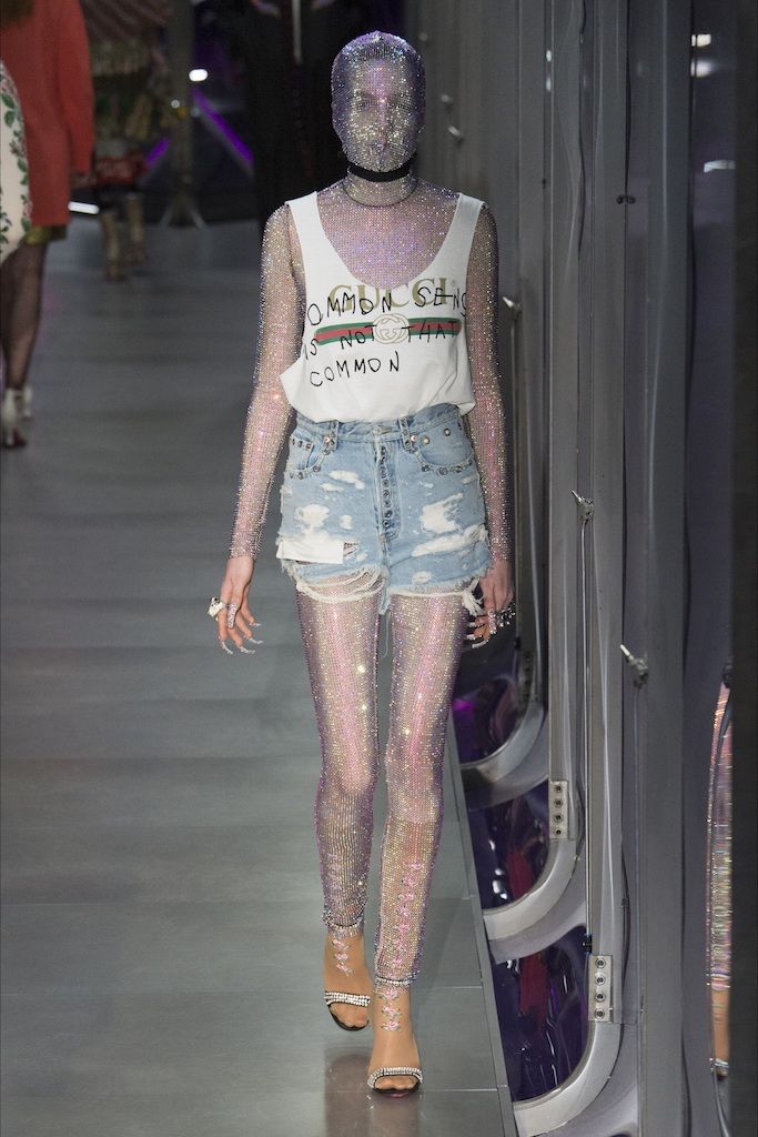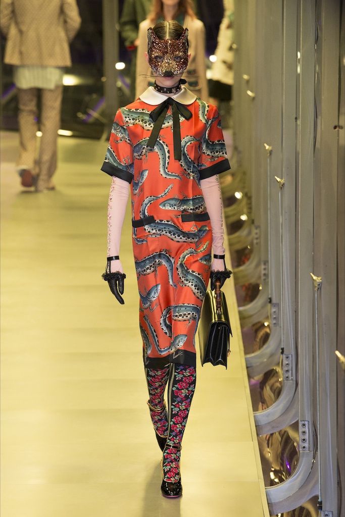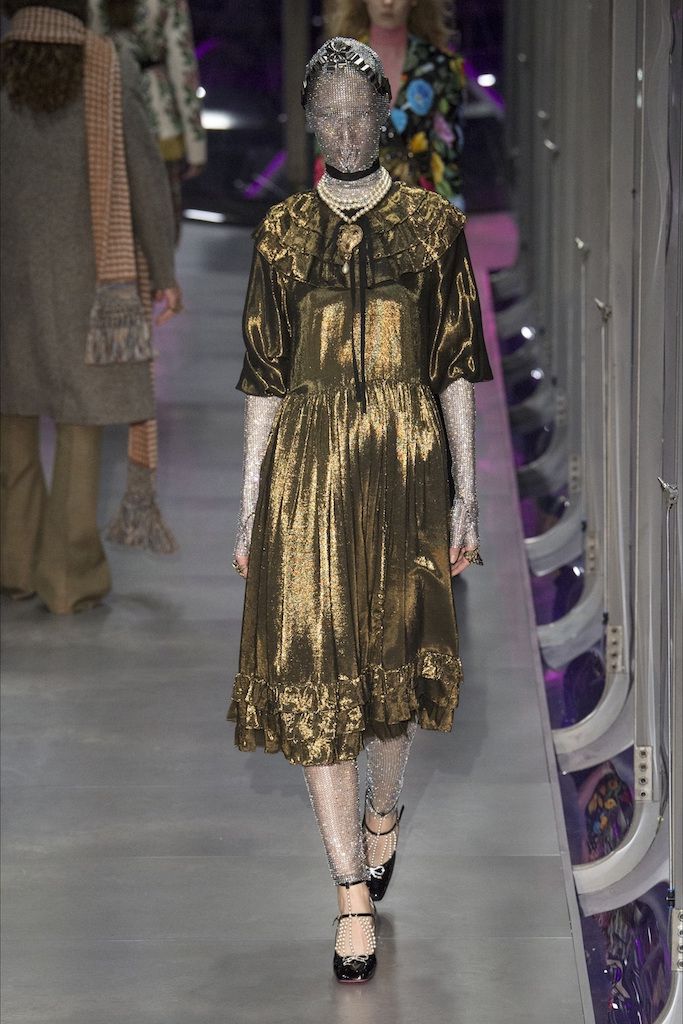 Il volto celato, coperto da una maschera, spesso di maglia, è uno dei più iconici segni di stile della Maison Margiela ed è stato riproposto da Gucci in una variante scintillante, tempestata di cristalli. Questo è forse il richiamo più forte al lavoro di Margiela e dei suoi successori ed è sicuramente quello che ha innescato i primi campanelli d'allarme riguardo l'ipotesi di plagio. Gucci tuttavia non è il primo ad emulare Margiela, comprendo i volti delle modelle. Alexander McQueen, Gareth Pugh, Thom Browne e A. F. Vandervorst sono solo alcuni esempi di designer che son stati affascinati dall'idea di far sfilare modelli e modelle prive di volto, omaggiando così Margiela. Alessandro Michele è semplicemente l'ultimo di un lungo elenco. Coprire i volto è un espediente per porre l'accento sulla collezione ed occultare tutto ciò che può distogliere lo sguardo dagli abiti. Una maschera poi può diventare anche un elemento per elevare lo styling di una collezione. La maschera può infatti rappresentare l'inespressività, il nulla, ma anche un'espressività ipertrofica ed esacerbata. Persino i successori di Margiela hanno portato in passerella una versione dell'iconica maschera coperta di gemme, che chiaramente sovvertiva il significato originale di privazione ed annullamento minimalistico inteso da Martin. Alessandro Michele ha voluto inserire l'elemento del volto coperto per creare un'allure ancora più surreale e misteriosa alla collezione.