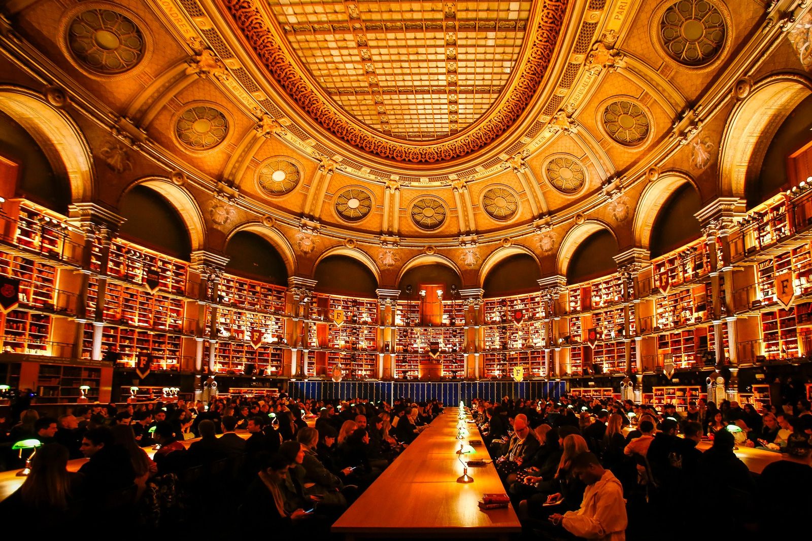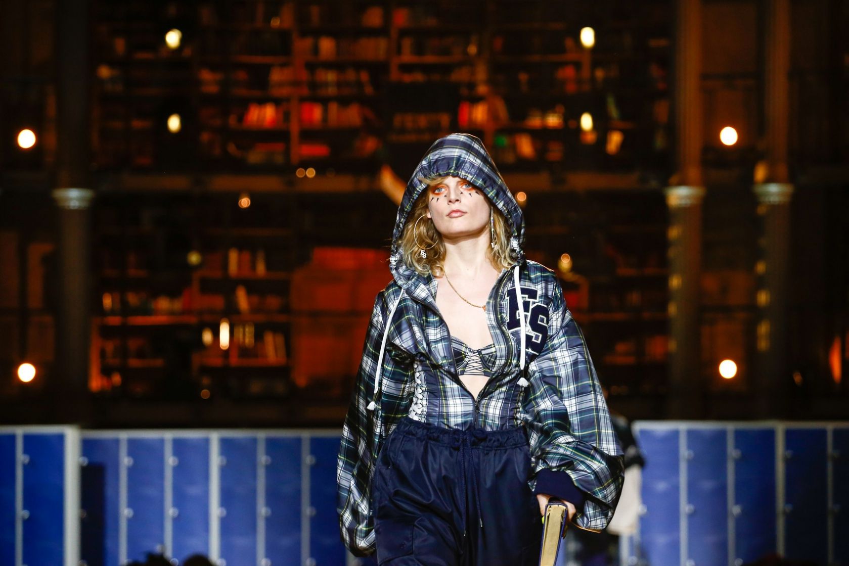 Per restare sempre a tema college, la sfilata si è tenuta all'interno della suggestiva Bibliothèque Nationale de France, utilizzando i tavoli da studio, dotati di libri e lampade da tavolo, come passerella. Il sogno di ogni studente ribelle!