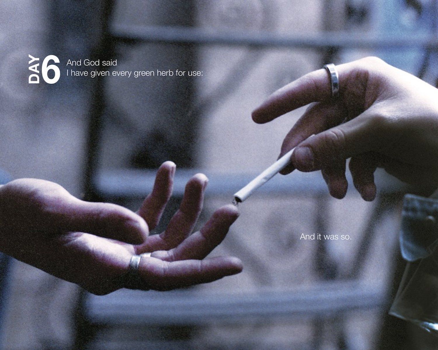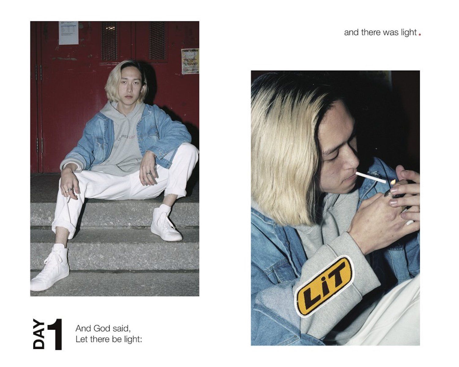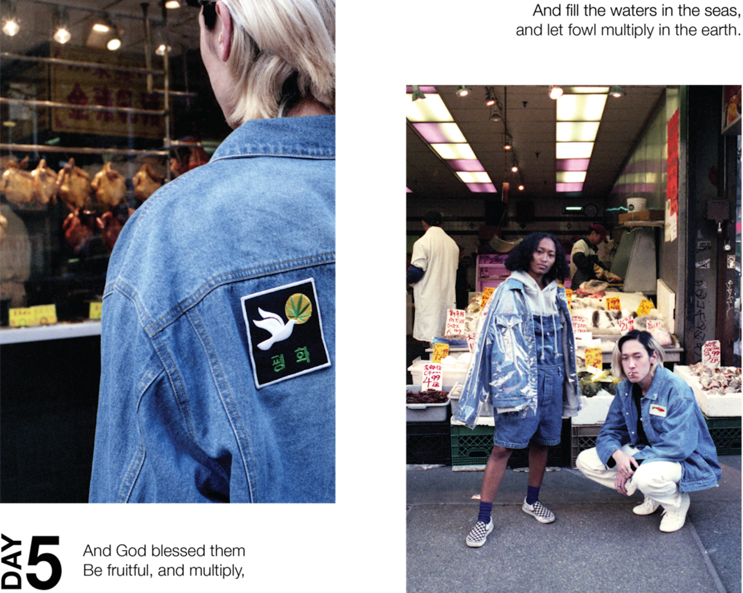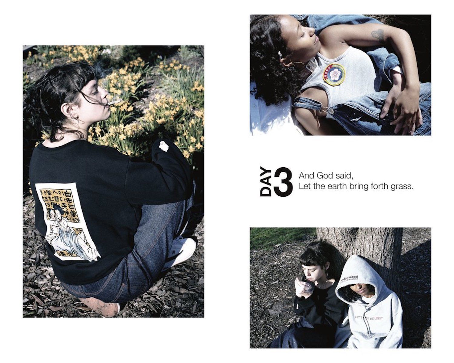 è la frase biblica che apre il lookbook, mostrandoci un giovane modello impegnato ad accendersi una sigaretta. E così via, fino al sesto giorno, in cui due mani si passano una canna – richiamando l'affresco La Creazione di Adamo di Michelangelo Buonarroti – e al settimo, rinominato “Sundae”.