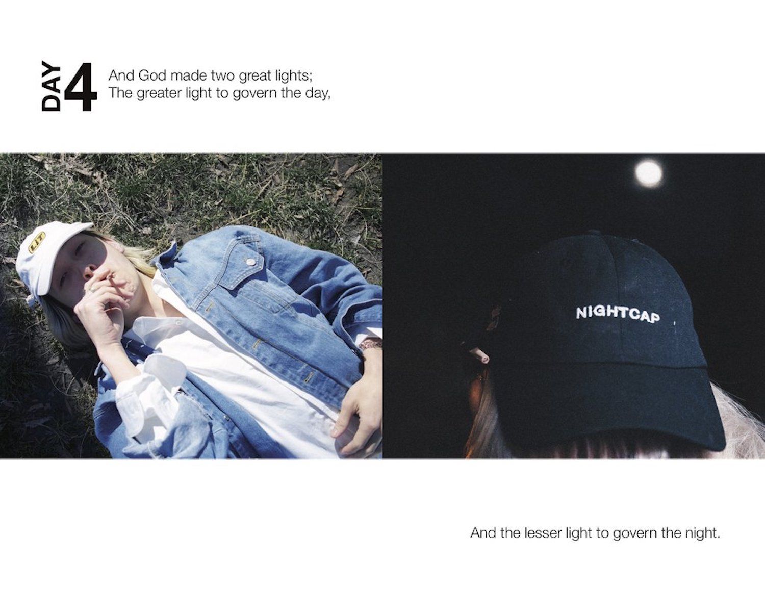 Ogni scatto richiama i sette giorni della Creazione, mixando il concept del brand e i capi realizzati con l'immaginario biblico. Streetwear e urban attitude si mescolano ai temi della Genesi, ma richiamando anche le influenze asiatiche del brand. T-shirts, felpe e giacche di jeans, infatti, sono decorate con stampe e toppe che richiamano la cultura orientale, come il fiore di loto, le geishe e le maestose tigri. A rendere il tutto ancora più trendy e contemporaneo, ci pensano i cappellini con la frase “NIGHTCAP” e le felpe stampate col logo del brand, come vuole la migliore tradizione dello streetwear di oggi.