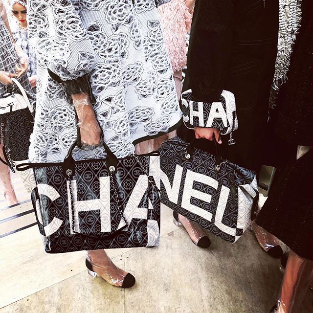 Da sempre capostipite della "logo-mania", Maison Chanel fa sfilare le modelle a Parigi con maxi bags black and white, morbide, dal manico corto, avvolte totalmente dalla scritta bold Chanel.