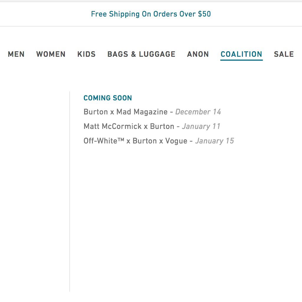 In questa prospettiva si sono mossi il noto brand di Virgil Abloh, il mondo dello snowboard di Burton e quello del fashion di Vogue. La notizia è stata diffusa pochi giorni fa dal sito ufficiale di Burton che nella sezione "coalition" aveva inserito la dicitura OFF-WHITE x Burton x Vogue - January 15. Un'ottima strategia per generare curiosità fra gli amanti del brand e, al tempo stesso, attirare a sé un pubblico del tutto differente.