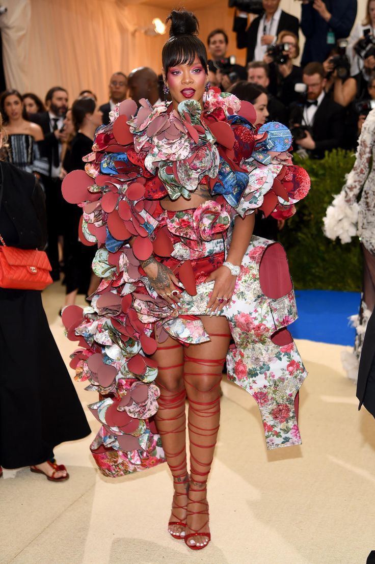 Solo quest’anno segnaliamo Riri in total look Gucci FW17 by Alessandro Michele al Coachella, in mantello col cappuccio in velluto per un episodio di Bates Motel, in micro bikini gioiello e piume colorate al Barbados Carnival Festival, in uno scultoreo Comme des Garçons FW16 al Met Gala.