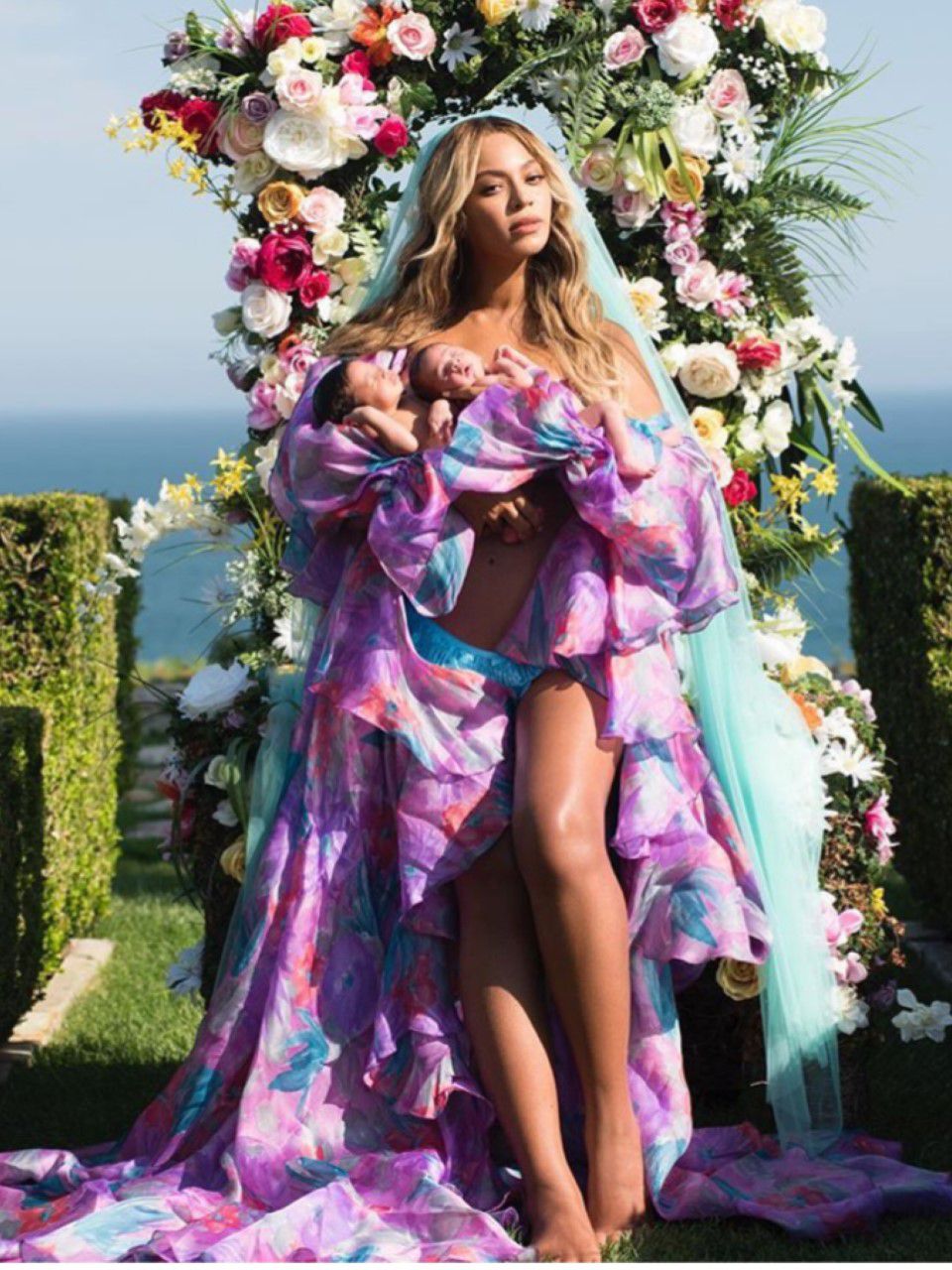 Mercoledì 1 Febbraio Bey posta sul suo profilo Instagram un fotografia, studiata dall’artista multimediale Awol Erizku, che la ritrae, pancione in bella vista, in versione Vergine di Guadalupe accovacciata di fronte a un muro di fiori colorati.