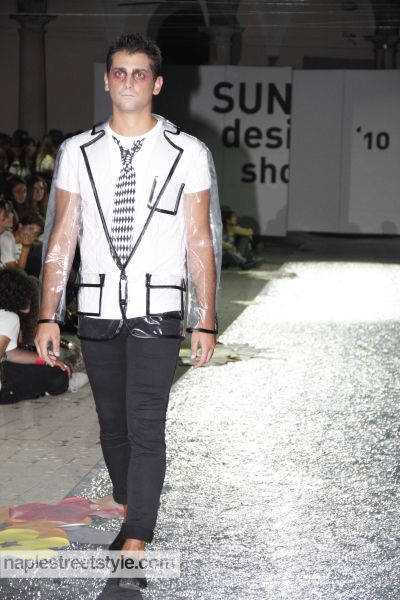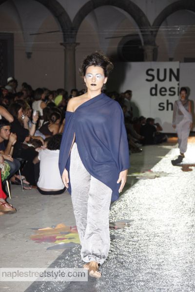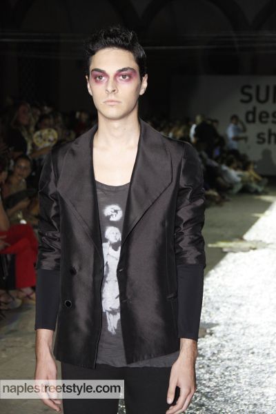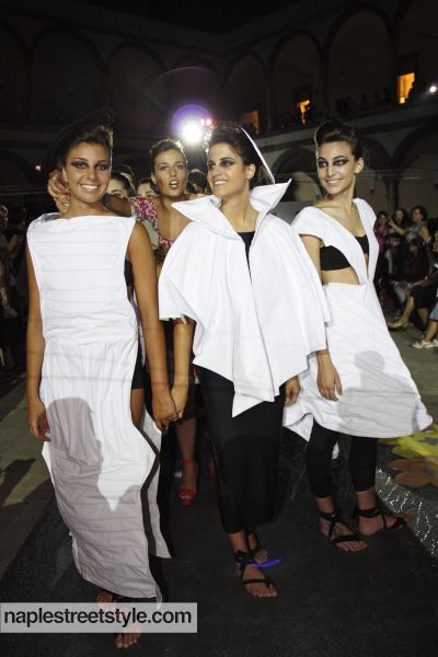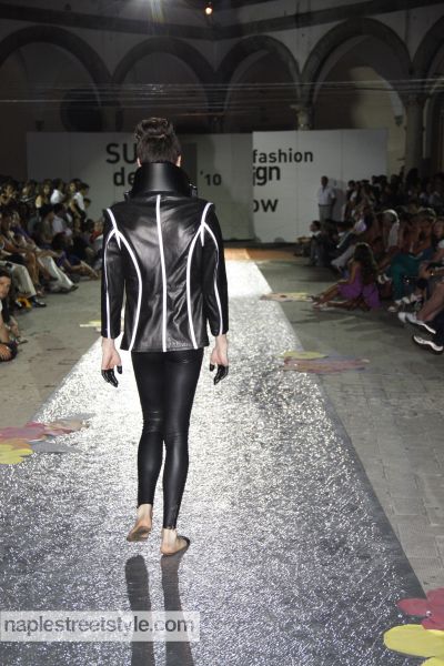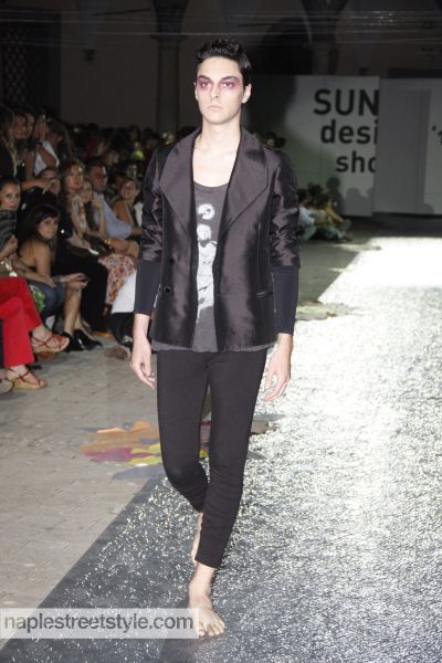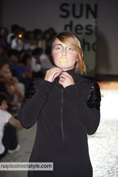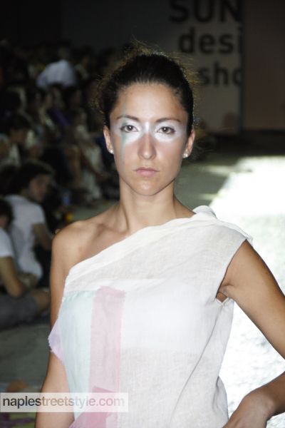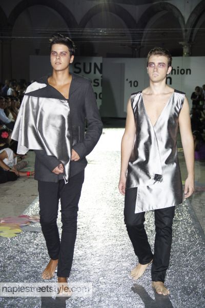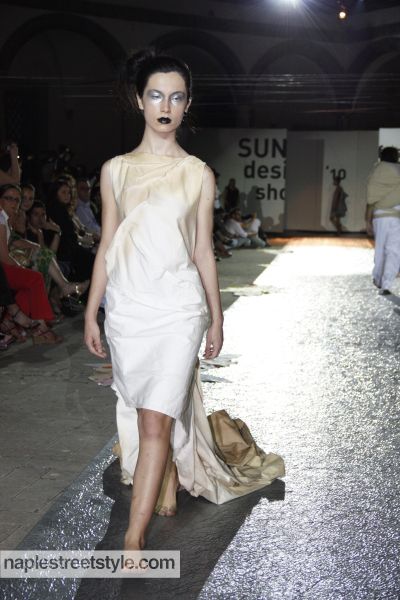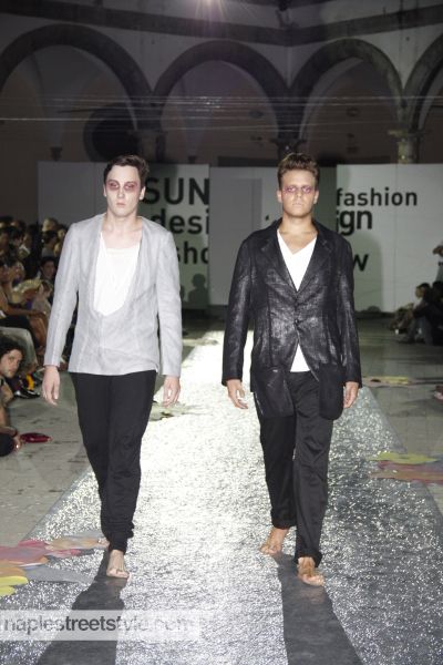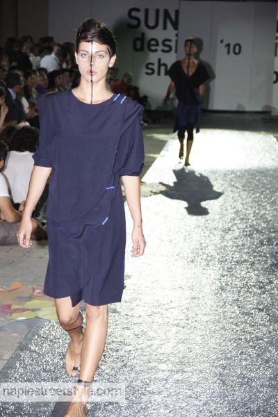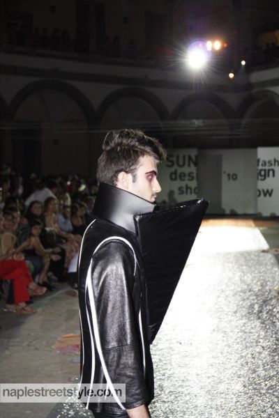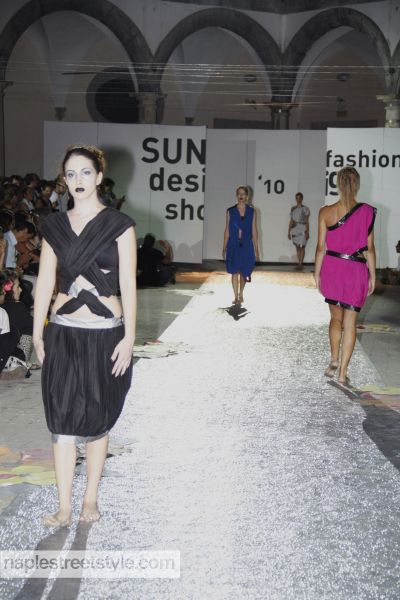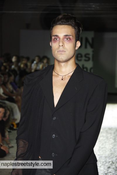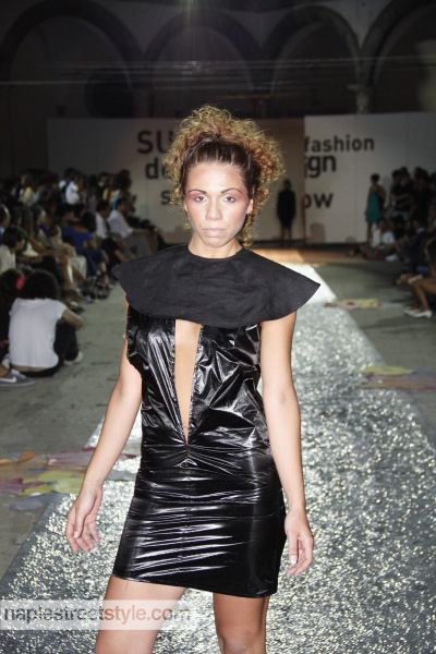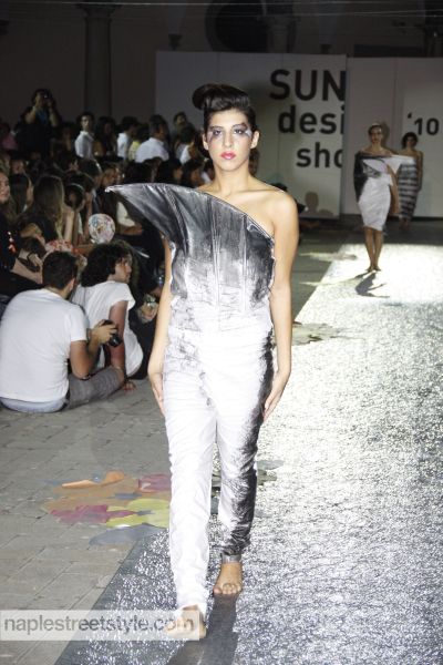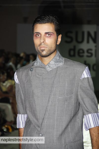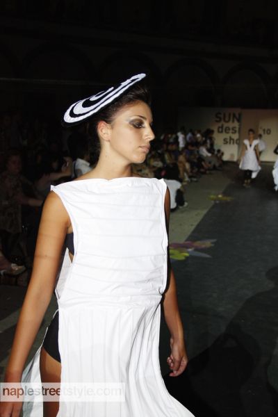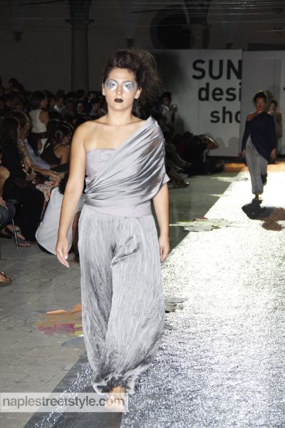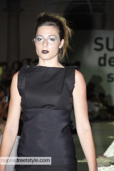 Ma non dimentichiamoci che il SUN Fashion Design Show è il frutto del lavoro di stilisti, si, ma che son sempre studenti. Allora gli oggetti del defilé non sono semplici manifestazioni del loro estro, ma anche prodotti didattici, risultati di un anno intero di corsi e, in alcuni casi, vere e proprie tesi di laurea. Eccola qua, la doppia trepidazione dello stilista-studente. E a noi che siamo intervenuti quella sera da spettatori, da popolo che solamente a sprazzi ha goduto delle luci dei riflettori, solo per quella frazione nella quale i modelli ci passavano davanti, brillando così della loro luce riflessa, cosa è rimasto? E’ rimasto il ricordo di una calda sera d’estate nella suggestiva Abbazia di San Lorenzo ad Septimum, di tre collezioni susseguitesi in maniera piacevole e veloce, scorrendo le quali è stato bello vedere l’evoluzione e la maturità che un simile corso di laurea è in grado di conferire: quella del primo anno che ha rivisitato lo stile Novecentesco in chiave moderna (seguita dai professori Patrizia Ranzo ed Erminia Pagano), quella del secondo anno ispirata al nuovo classicismo sartoriale (seguita dai professori Roberto Liberti ed Erminia Pagano), ed infine quella del terzo anno, degli attesi tesisti ( Maria Antonietta Sbordone, Mario Montanino e Gianni Grasso) con i loro esercizi di stile e la sperimentazione di nuovi materiali tecnologici.