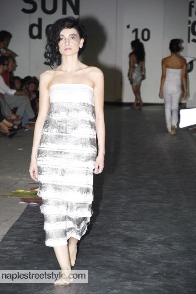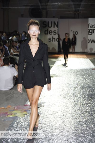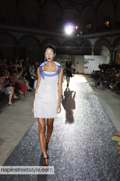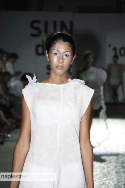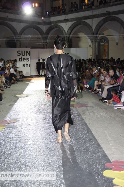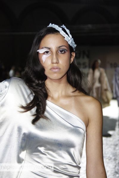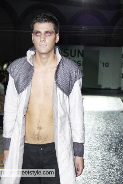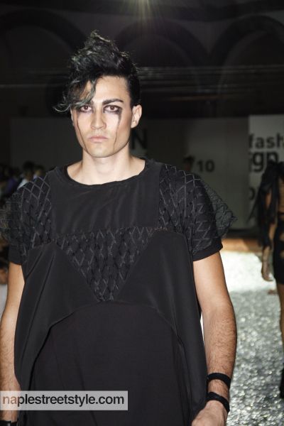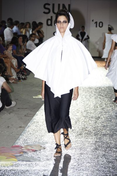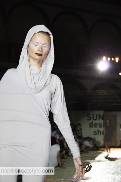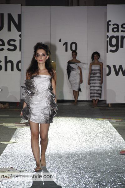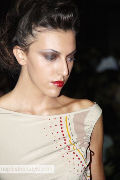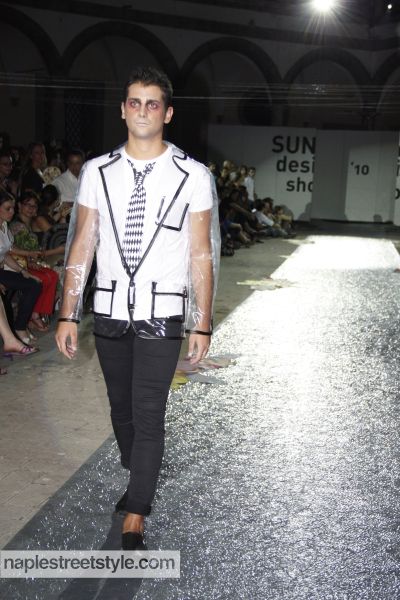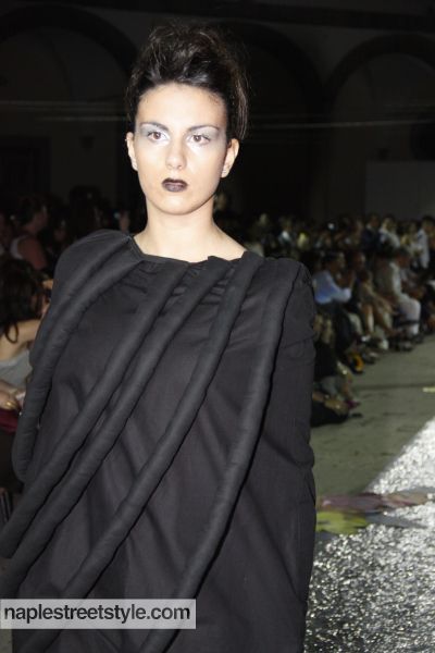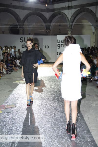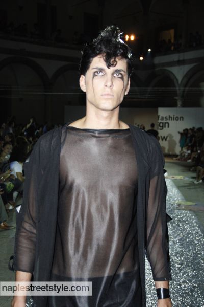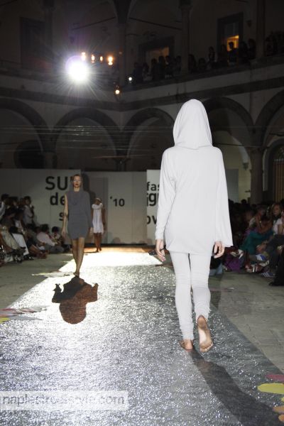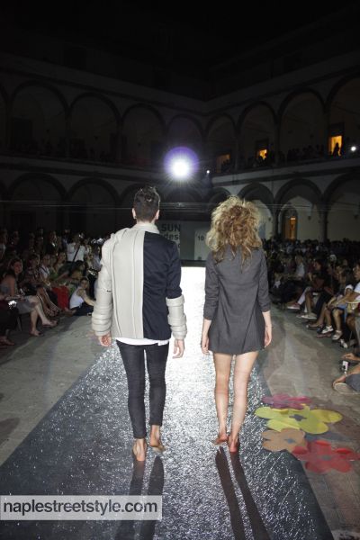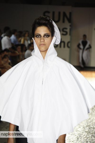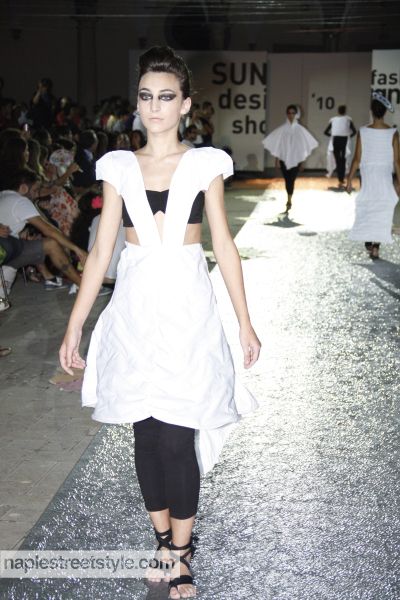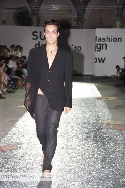 Ma non dimentichiamoci che il SUN Fashion Design Show è il frutto del lavoro di stilisti, si, ma che son sempre studenti. Allora gli oggetti del defilé non sono semplici manifestazioni del loro estro, ma anche prodotti didattici, risultati di un anno intero di corsi e, in alcuni casi, vere e proprie tesi di laurea. Eccola qua, la doppia trepidazione dello stilista-studente. E a noi che siamo intervenuti quella sera da spettatori, da popolo che solamente a sprazzi ha goduto delle luci dei riflettori, solo per quella frazione nella quale i modelli ci passavano davanti, brillando così della loro luce riflessa, cosa è rimasto? E’ rimasto il ricordo di una calda sera d’estate nella suggestiva Abbazia di San Lorenzo ad Septimum, di tre collezioni susseguitesi in maniera piacevole e veloce, scorrendo le quali è stato bello vedere l’evoluzione e la maturità che un simile corso di laurea è in grado di conferire: quella del primo anno che ha rivisitato lo stile Novecentesco in chiave moderna (seguita dai professori Patrizia Ranzo ed Erminia Pagano), quella del secondo anno ispirata al nuovo classicismo sartoriale (seguita dai professori Roberto Liberti ed Erminia Pagano), ed infine quella del terzo anno, degli attesi tesisti ( Maria Antonietta Sbordone, Mario Montanino e Gianni Grasso) con i loro esercizi di stile e la sperimentazione di nuovi materiali tecnologici.