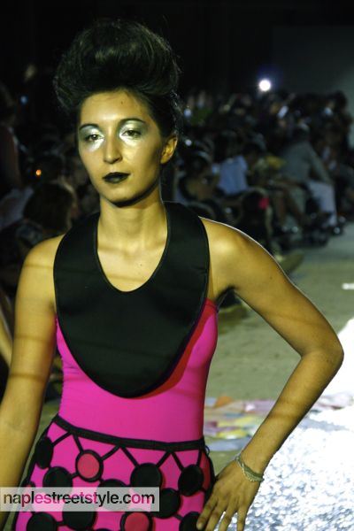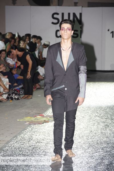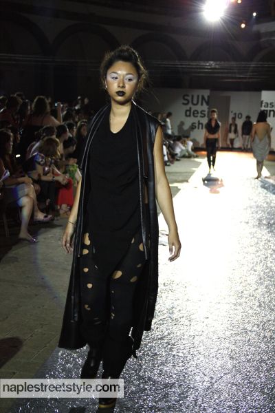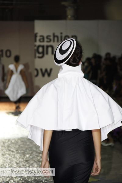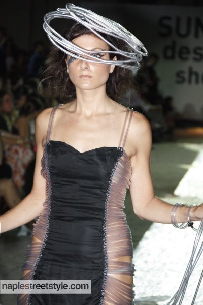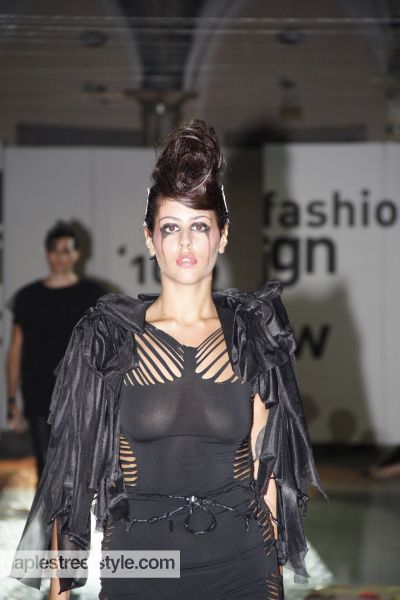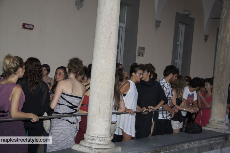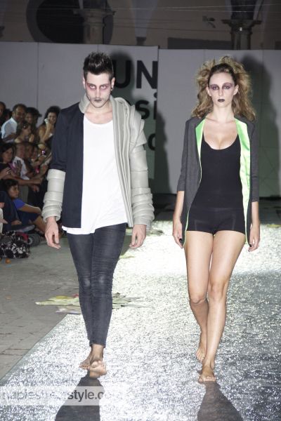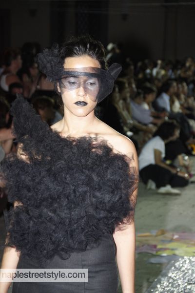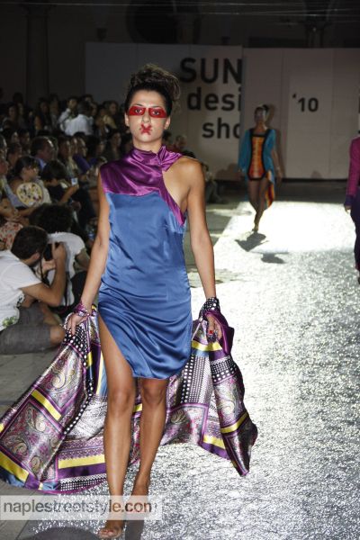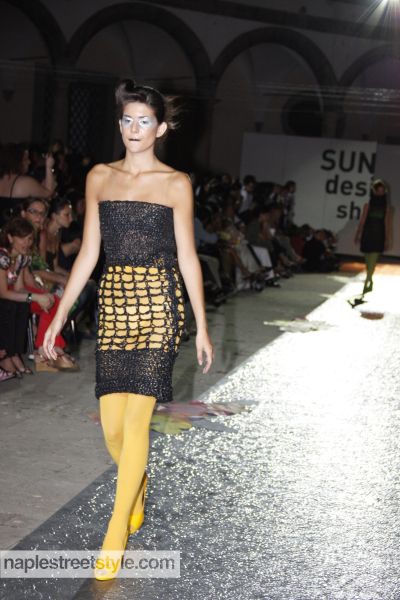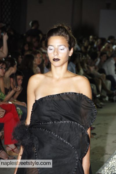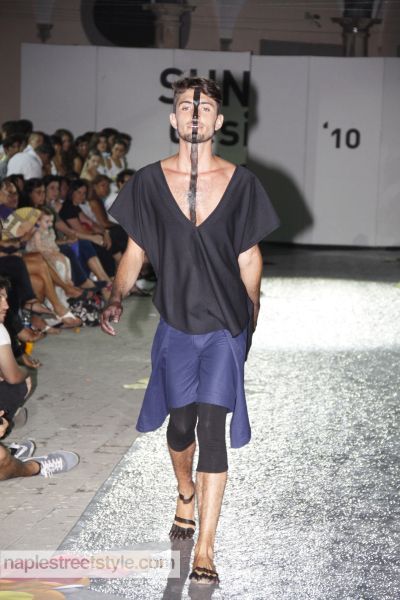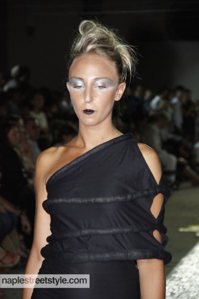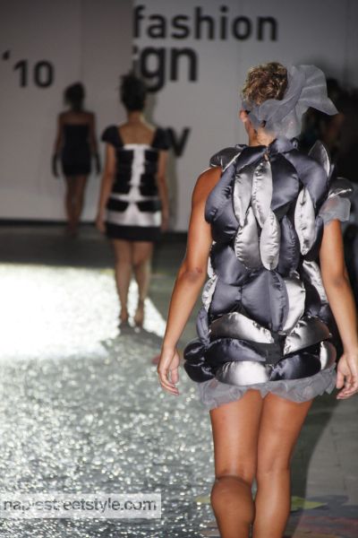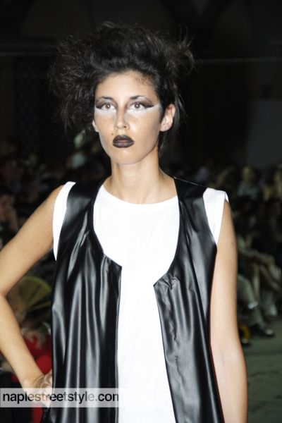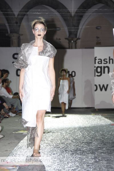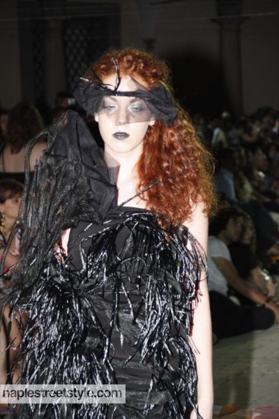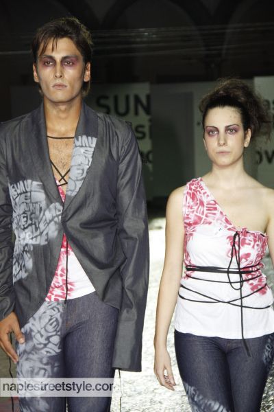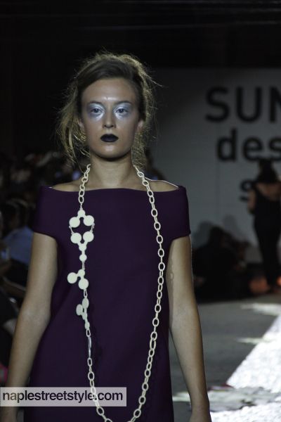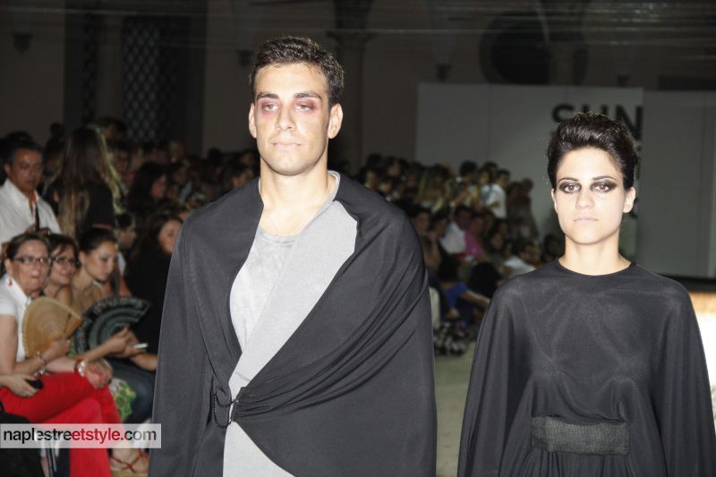 Ma non dimentichiamoci che il SUN Fashion Design Show è il frutto del lavoro di stilisti, si, ma che son sempre studenti. Allora gli oggetti del defilé non sono semplici manifestazioni del loro estro, ma anche prodotti didattici, risultati di un anno intero di corsi e, in alcuni casi, vere e proprie tesi di laurea. Eccola qua, la doppia trepidazione dello stilista-studente. E a noi che siamo intervenuti quella sera da spettatori, da popolo che solamente a sprazzi ha goduto delle luci dei riflettori, solo per quella frazione nella quale i modelli ci passavano davanti, brillando così della loro luce riflessa, cosa è rimasto? E’ rimasto il ricordo di una calda sera d’estate nella suggestiva Abbazia di San Lorenzo ad Septimum, di tre collezioni susseguitesi in maniera piacevole e veloce, scorrendo le quali è stato bello vedere l’evoluzione e la maturità che un simile corso di laurea è in grado di conferire: quella del primo anno che ha rivisitato lo stile Novecentesco in chiave moderna (seguita dai professori Patrizia Ranzo ed Erminia Pagano), quella del secondo anno ispirata al nuovo classicismo sartoriale (seguita dai professori Roberto Liberti ed Erminia Pagano), ed infine quella del terzo anno, degli attesi tesisti ( Maria Antonietta Sbordone, Mario Montanino e Gianni Grasso) con i loro esercizi di stile e la sperimentazione di nuovi materiali tecnologici.