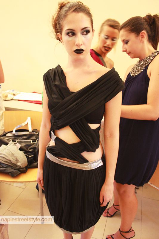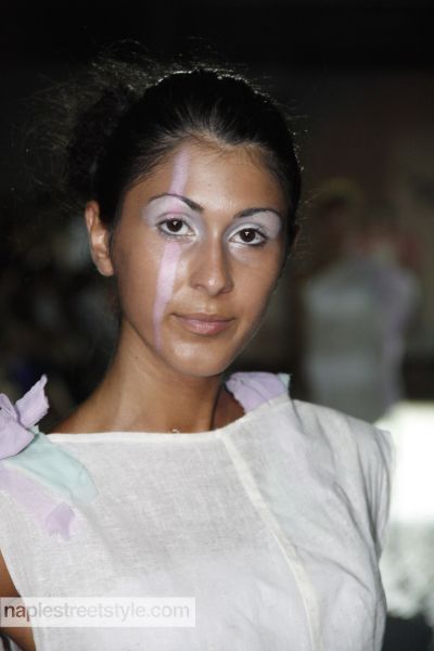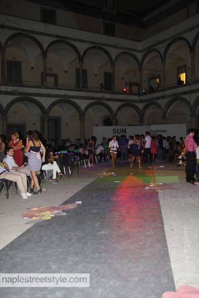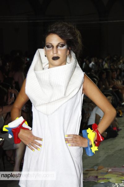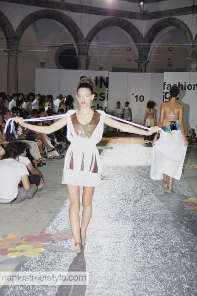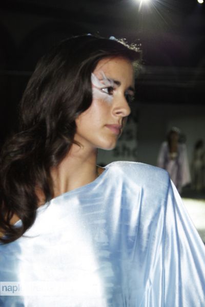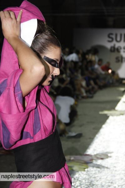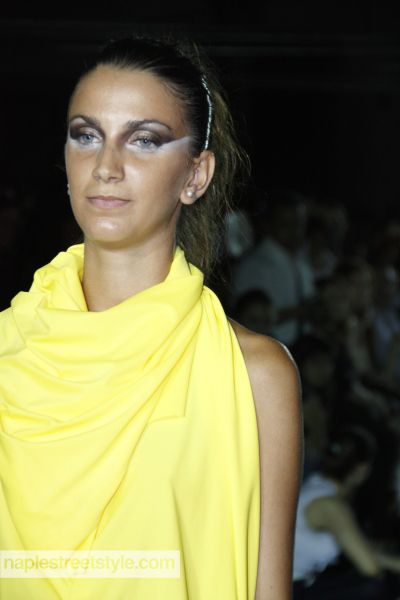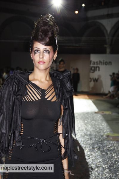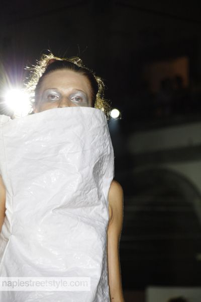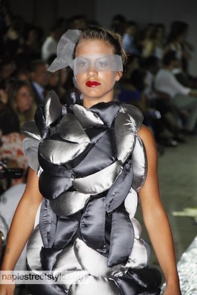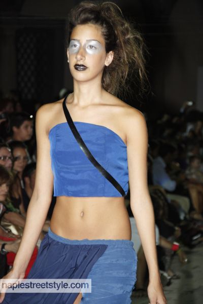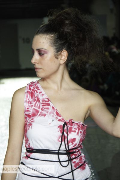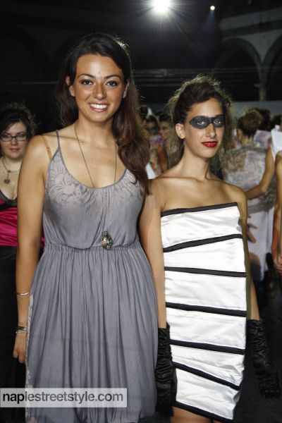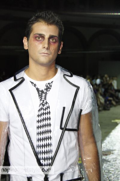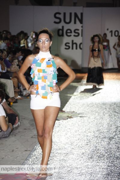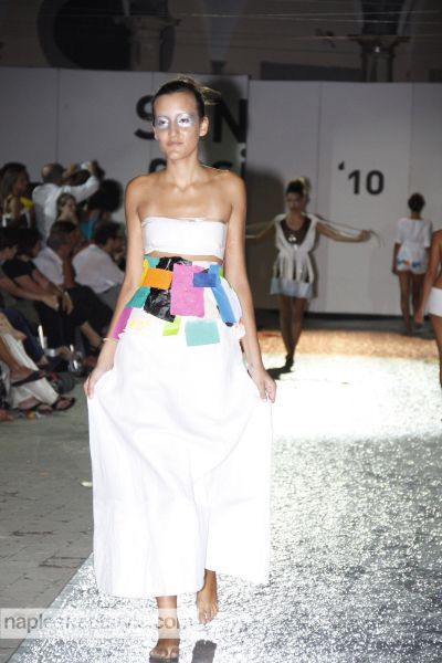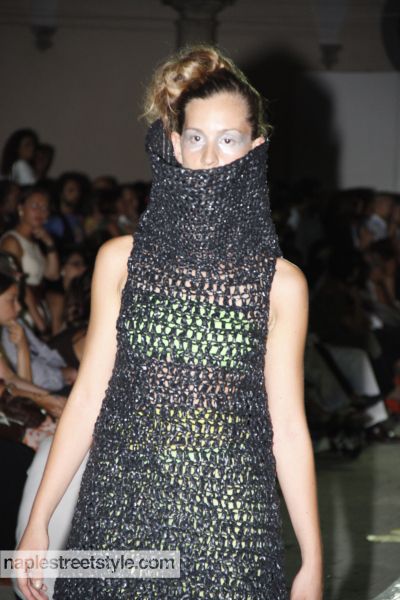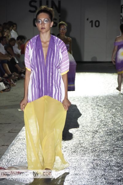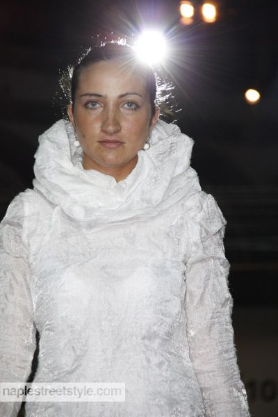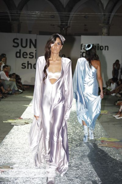 Ma non dimentichiamoci che il SUN Fashion Design Show è il frutto del lavoro di stilisti, si, ma che son sempre studenti. Allora gli oggetti del defilé non sono semplici manifestazioni del loro estro, ma anche prodotti didattici, risultati di un anno intero di corsi e, in alcuni casi, vere e proprie tesi di laurea. Eccola qua, la doppia trepidazione dello stilista-studente. E a noi che siamo intervenuti quella sera da spettatori, da popolo che solamente a sprazzi ha goduto delle luci dei riflettori, solo per quella frazione nella quale i modelli ci passavano davanti, brillando così della loro luce riflessa, cosa è rimasto? E’ rimasto il ricordo di una calda sera d’estate nella suggestiva Abbazia di San Lorenzo ad Septimum, di tre collezioni susseguitesi in maniera piacevole e veloce, scorrendo le quali è stato bello vedere l’evoluzione e la maturità che un simile corso di laurea è in grado di conferire: quella del primo anno che ha rivisitato lo stile Novecentesco in chiave moderna (seguita dai professori Patrizia Ranzo ed Erminia Pagano), quella del secondo anno ispirata al nuovo classicismo sartoriale (seguita dai professori Roberto Liberti ed Erminia Pagano), ed infine quella del terzo anno, degli attesi tesisti ( Maria Antonietta Sbordone, Mario Montanino e Gianni Grasso) con i loro esercizi di stile e la sperimentazione di nuovi materiali tecnologici.