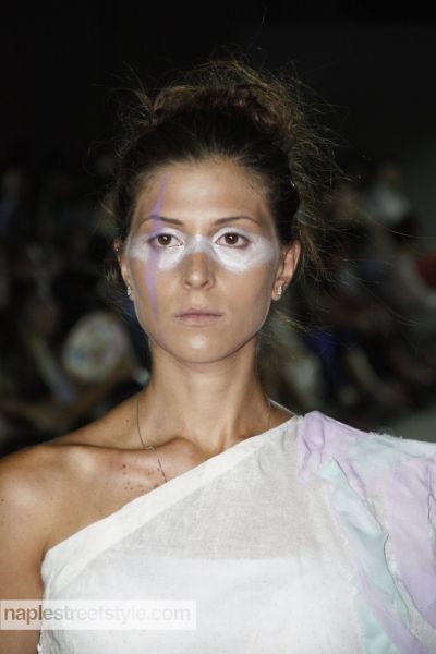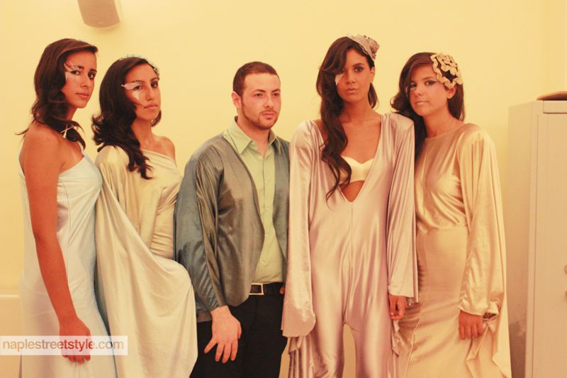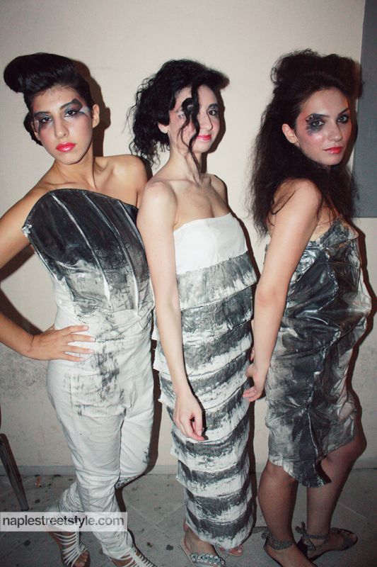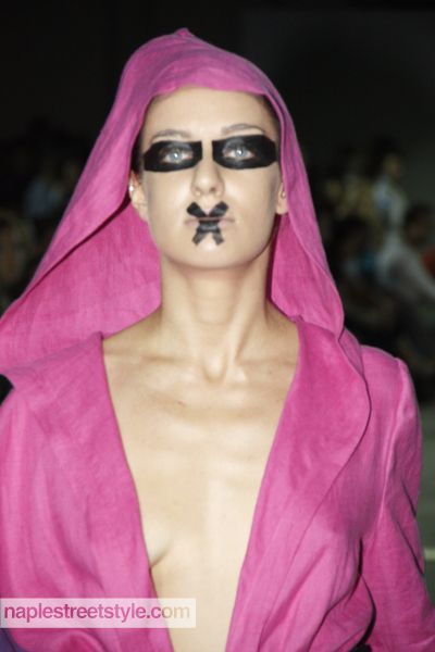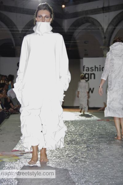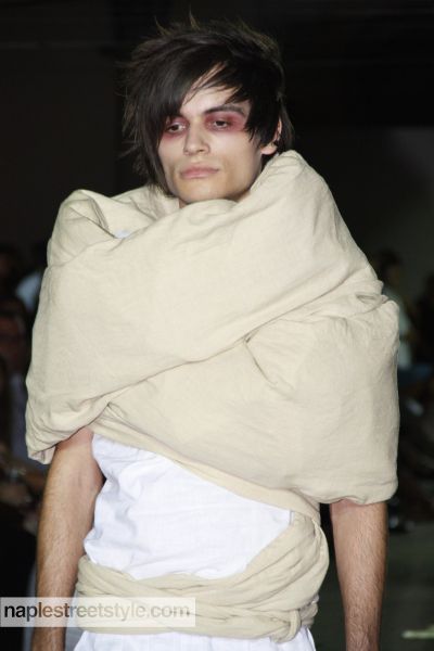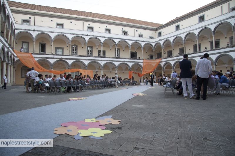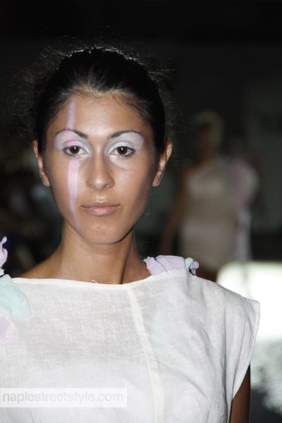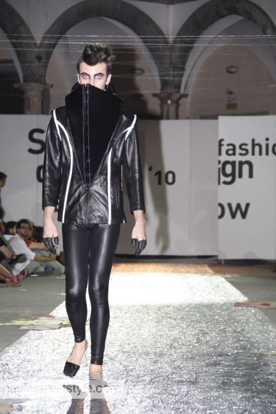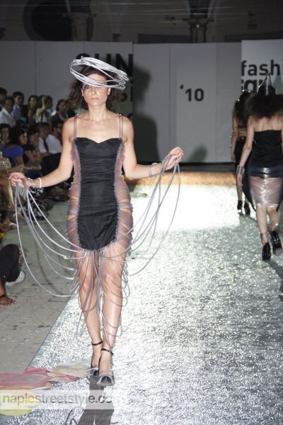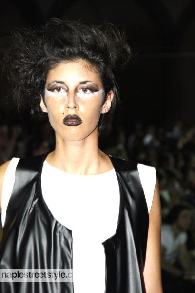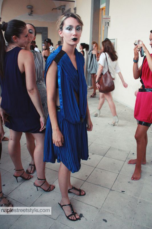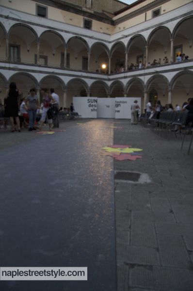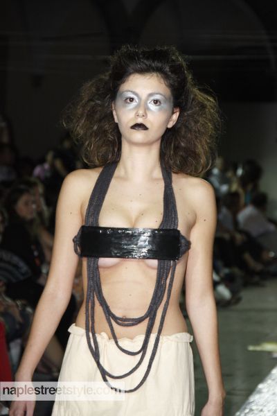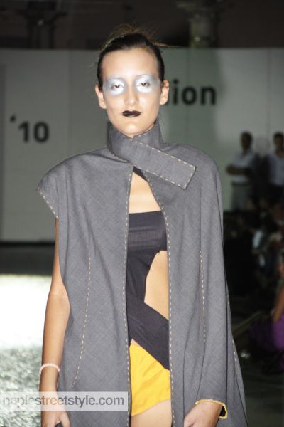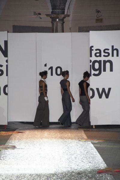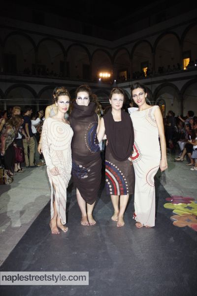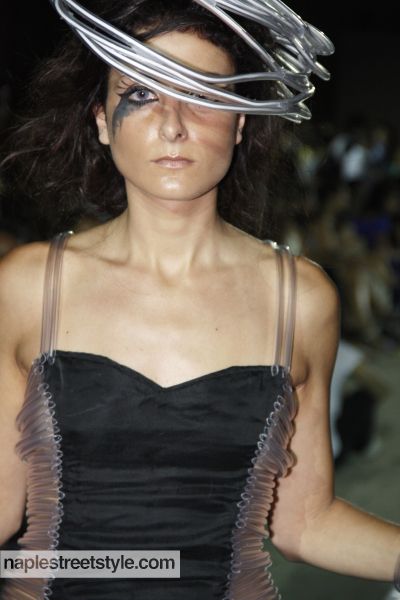 Ma non dimentichiamoci che il SUN Fashion Design Show è il frutto del lavoro di stilisti, si, ma che son sempre studenti. Allora gli oggetti del defilé non sono semplici manifestazioni del loro estro, ma anche prodotti didattici, risultati di un anno intero di corsi e, in alcuni casi, vere e proprie tesi di laurea. Eccola qua, la doppia trepidazione dello stilista-studente. E a noi che siamo intervenuti quella sera da spettatori, da popolo che solamente a sprazzi ha goduto delle luci dei riflettori, solo per quella frazione nella quale i modelli ci passavano davanti, brillando così della loro luce riflessa, cosa è rimasto? E’ rimasto il ricordo di una calda sera d’estate nella suggestiva Abbazia di San Lorenzo ad Septimum, di tre collezioni susseguitesi in maniera piacevole e veloce, scorrendo le quali è stato bello vedere l’evoluzione e la maturità che un simile corso di laurea è in grado di conferire: quella del primo anno che ha rivisitato lo stile Novecentesco in chiave moderna (seguita dai professori Patrizia Ranzo ed Erminia Pagano), quella del secondo anno ispirata al nuovo classicismo sartoriale (seguita dai professori Roberto Liberti ed Erminia Pagano), ed infine quella del terzo anno, degli attesi tesisti ( Maria Antonietta Sbordone, Mario Montanino e Gianni Grasso) con i loro esercizi di stile e la sperimentazione di nuovi materiali tecnologici.