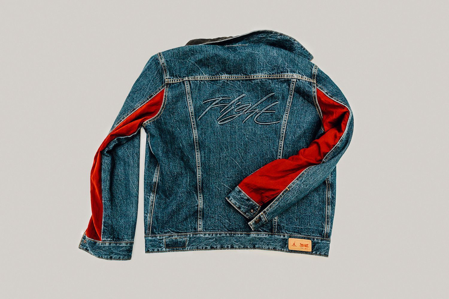 Le caratteristiche? Da un lato, due patch di taffetà color rosso cucite sulle maniche, e sul retro il logo Flight leggermente rialzato in silicone. Dall’altro taffetà traforato nero, con colletto in denim e il logo Jumpman Flight sul retro.