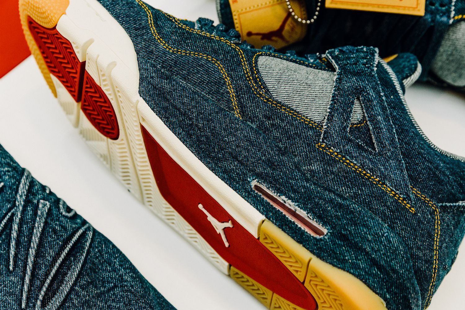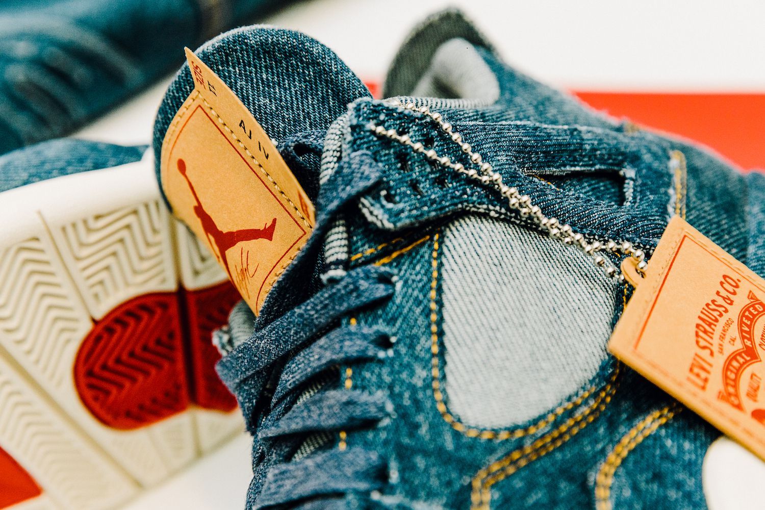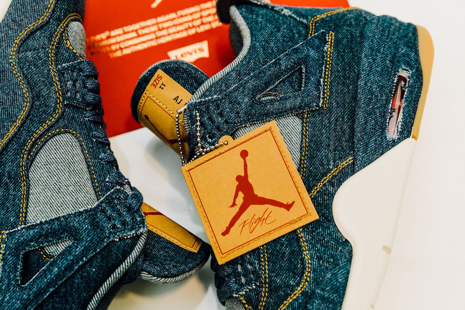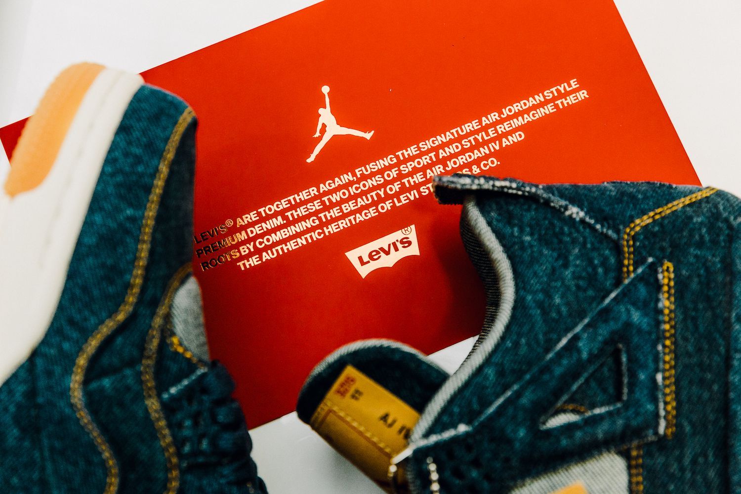 Le sneakers create da Tinker Hatfield nella nuova versione svelano una tomaia ricoperta in tessuto denim, cuciture in oro, lacci color denim, tag Levi's"Two Horse" modificato per includere il logo Jumpman, il classico Levi's Red Tab e dettagli in gomma sulla suola. L’altro elemento di questa mini capsule, la Jordan Reversible Trucker Jacket, combina l’iconico denim al taffetà del classico outfit sportivo del brand lanciato nel 1985.