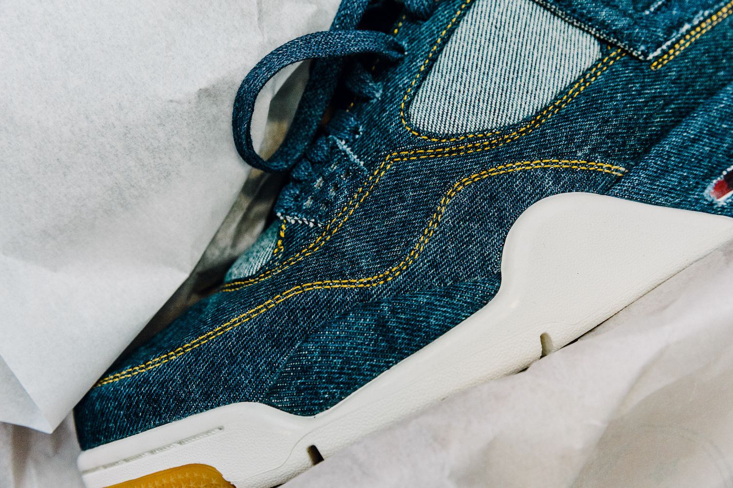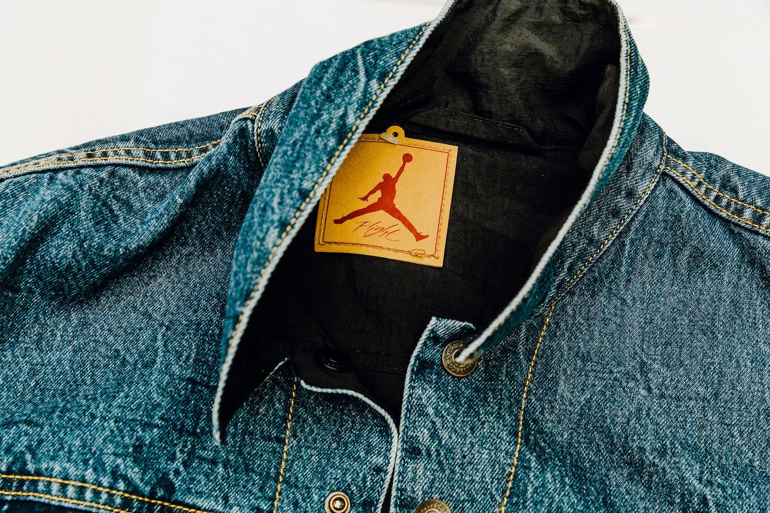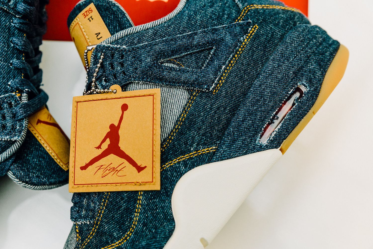 Le sneakers create da Tinker Hatfield nella nuova versione svelano una tomaia ricoperta in tessuto denim, cuciture in oro, lacci color denim, tag Levi's"Two Horse" modificato per includere il logo Jumpman, il classico Levi's Red Tab e dettagli in gomma sulla suola. L’altro elemento di questa mini capsule, la Jordan Reversible Trucker Jacket, combina l’iconico denim al taffetà del classico outfit sportivo del brand lanciato nel 1985.