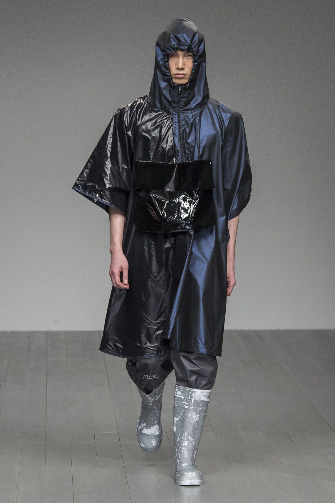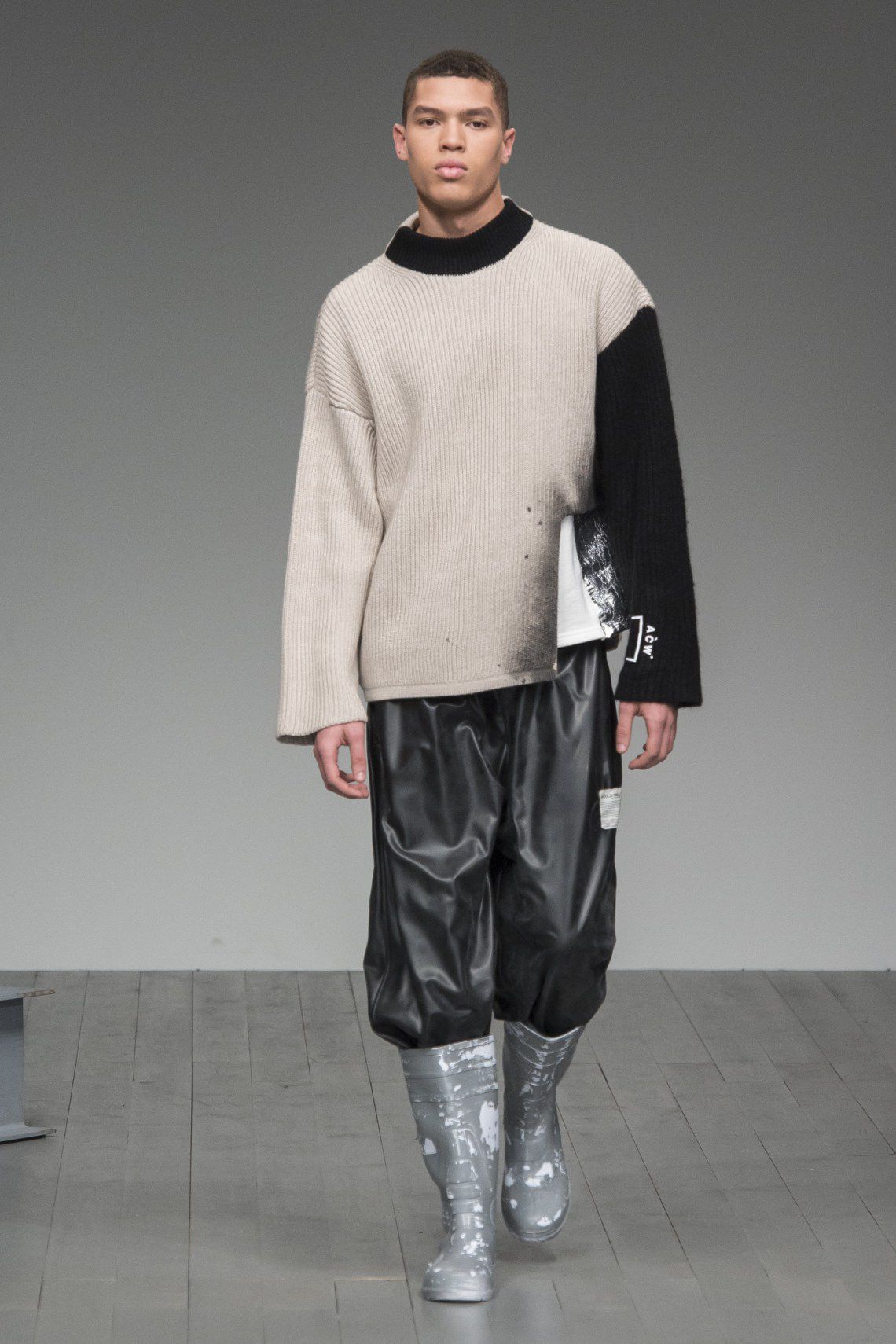 Il cappotto è oversize; i pantaloni da workman hanno una silhouette più asciutta,aderente e pannelli trasparenti; i pezzi di maglieria pesante sono tagliati e ricuciti; i soprabiti sono idrorepellenti, le giacche hanno dettagli metallici.