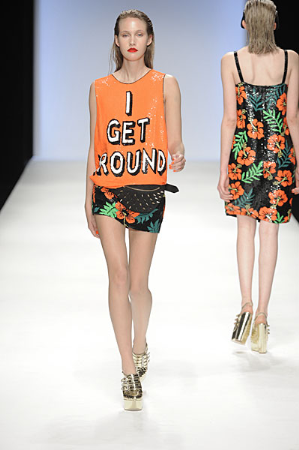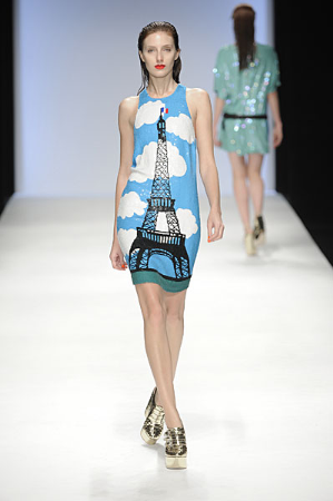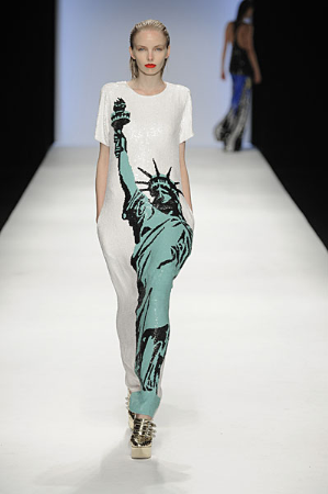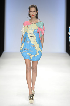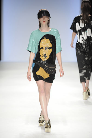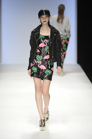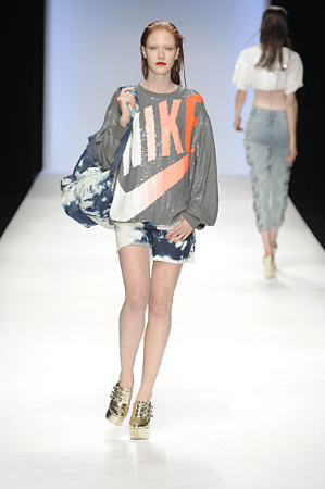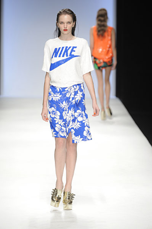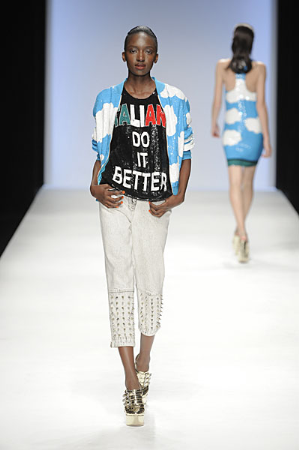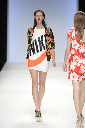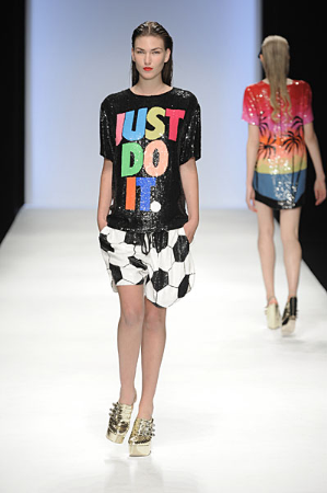 La passerella è un tripudio di colori flou, turchese, rosso, giallo, arancione, rosa, viola, scomposti a mo’ di mosaico in tante, tantissime pailettes e raccolti in forme inconsuete per un pret-a-porter: fenicotteri, coni gelato, statue della libertà, cartine geografiche, grattacieli e perfino la Gioconda. E poi, scorrendo le immagini, tra spalline borchiate (che attualmente non guastano, anzi, sembrano davvero immancabili), visiere in plexiglass e scarpe che più dorate non si può, spunta un segno globalmente riconosciuto: lo swoosh il logo della marca sportiva più famosa al mondo, la Nike, che ritorna anche nella citazione del suo slogan più celebre “Just do it”, immortalato in sequins multicolor su una maglia abbinata a un pantaloncino con fantasia “calcistica”, perfetta per accontentare il fidanzato che vuol rimanere a casa a guardare la partita nel pre-serata, e scatenarsi in pista fino all’alba, ed il tutto senza cambiarsi!